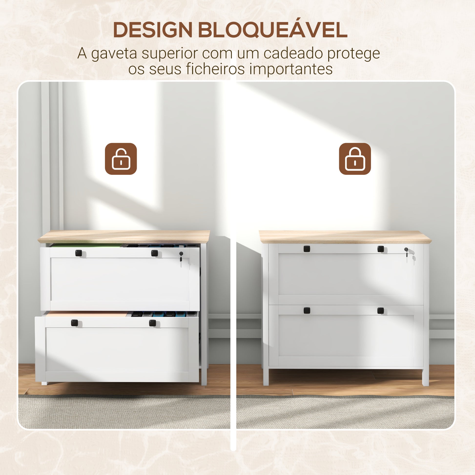 Armário de Escritório Móvel com 2 Gavetas e Fechadura - 79x40x72 cm - Branco e Madeira