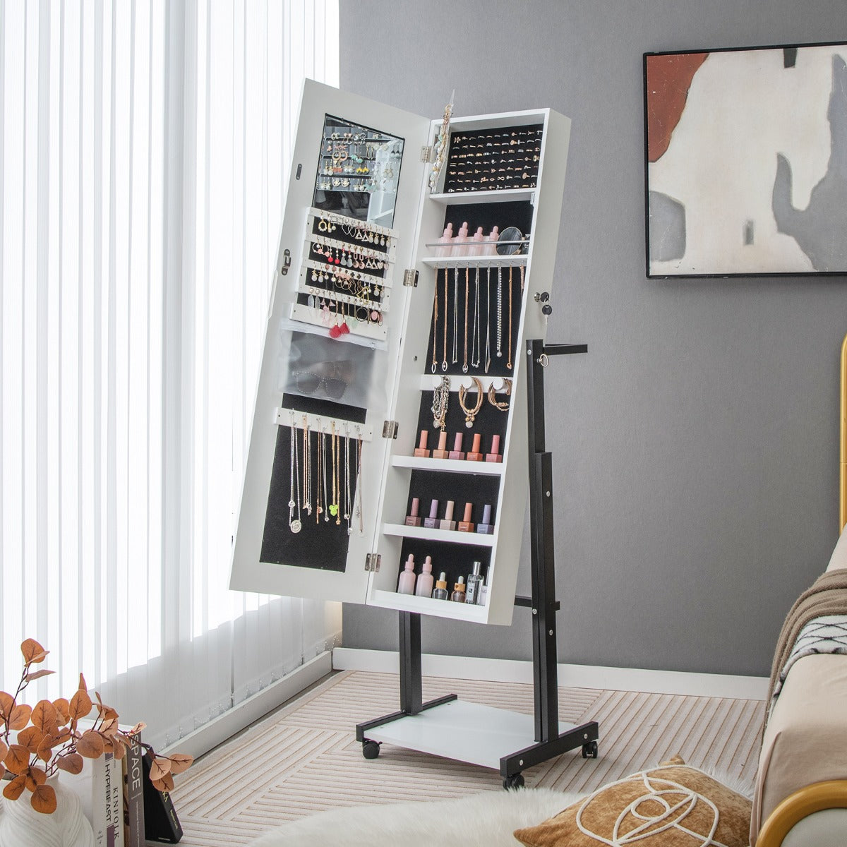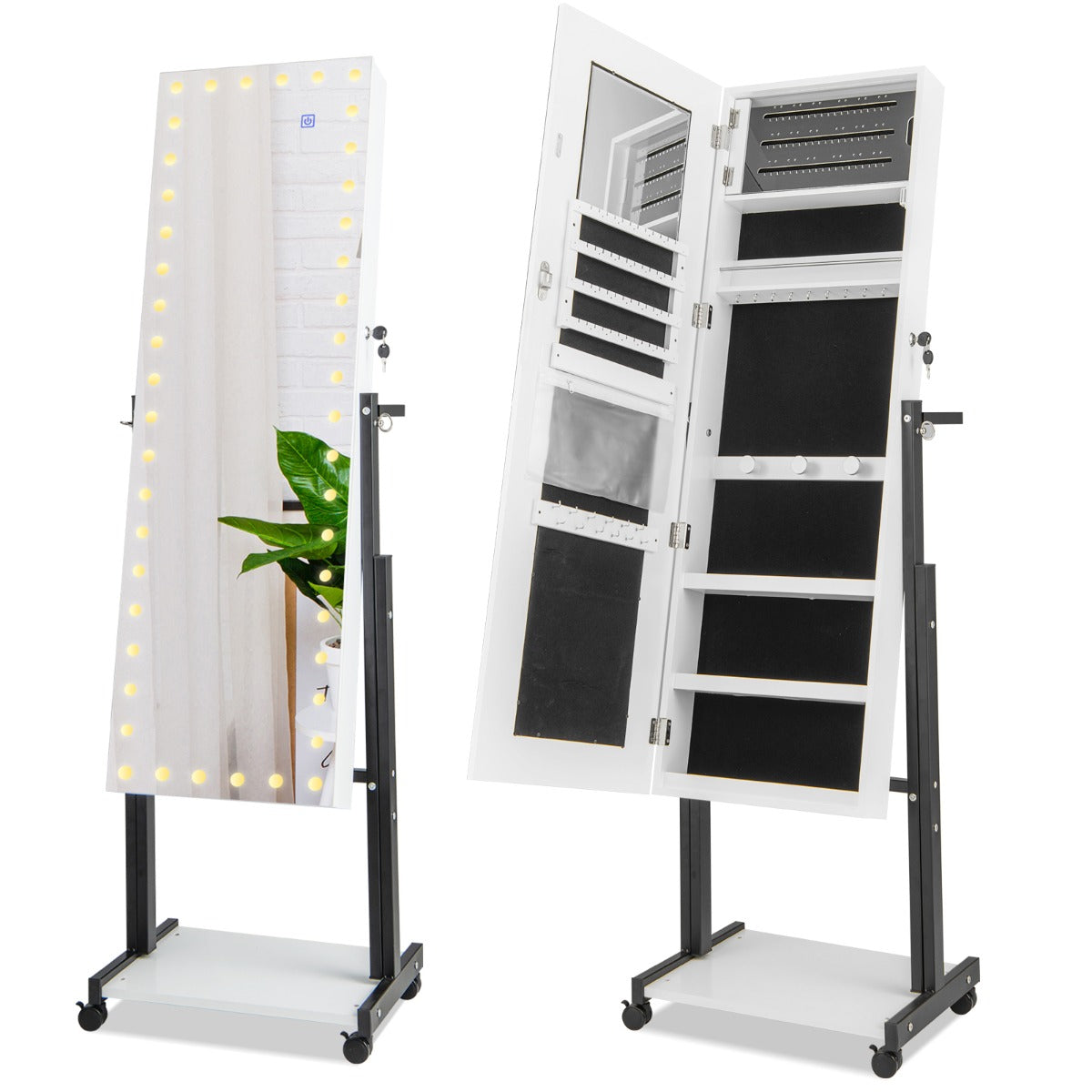 - Suporte de Metal Estável com Rodas: As pernas de metal garantem maior durabilidade e capacidade de carga em comparação com suportes de madeira. Equipado com 4 rodas universais bloqueáveis, este armário de jóias pode ser movido facilmente conforme as suas necessidades.