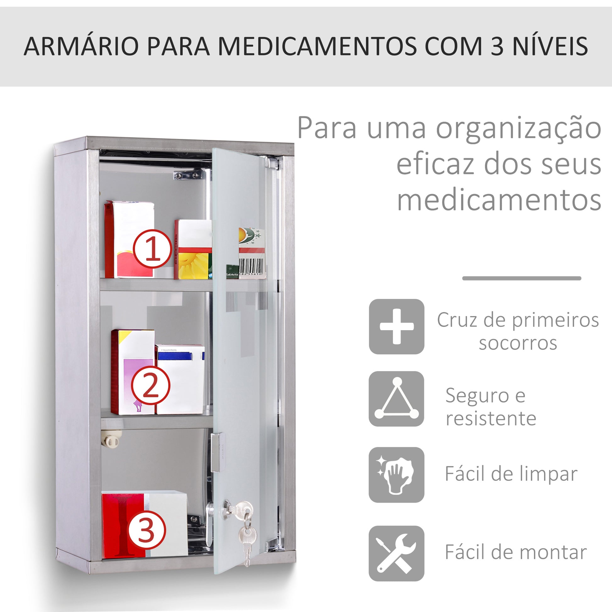 - Benefícios: Equipado com fechadura de segurança e 2 chaves para manter os medicamentos fora do alcance de terceiros. Possui 3 prateleiras internas para uma organização eficiente. Cruz de primeiros socorros gravada na porta para fácil identificação.