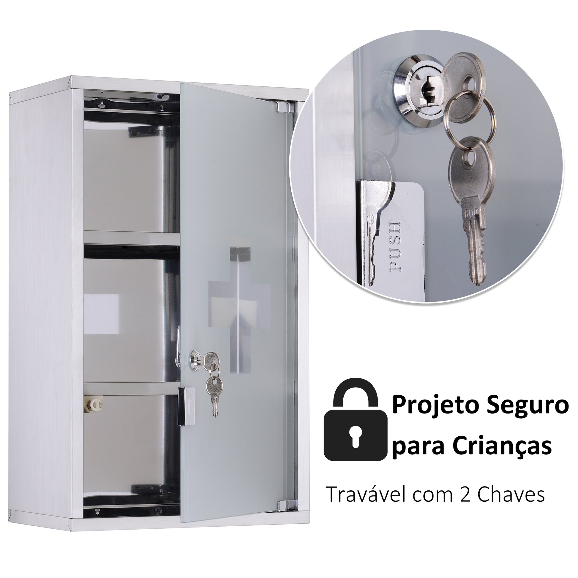 - Benefícios: Equipado com fechadura de segurança com 2 chaves, estrutura resistente à ferrugem, 3 compartimentos internos e cruz de primeiros socorros gravada