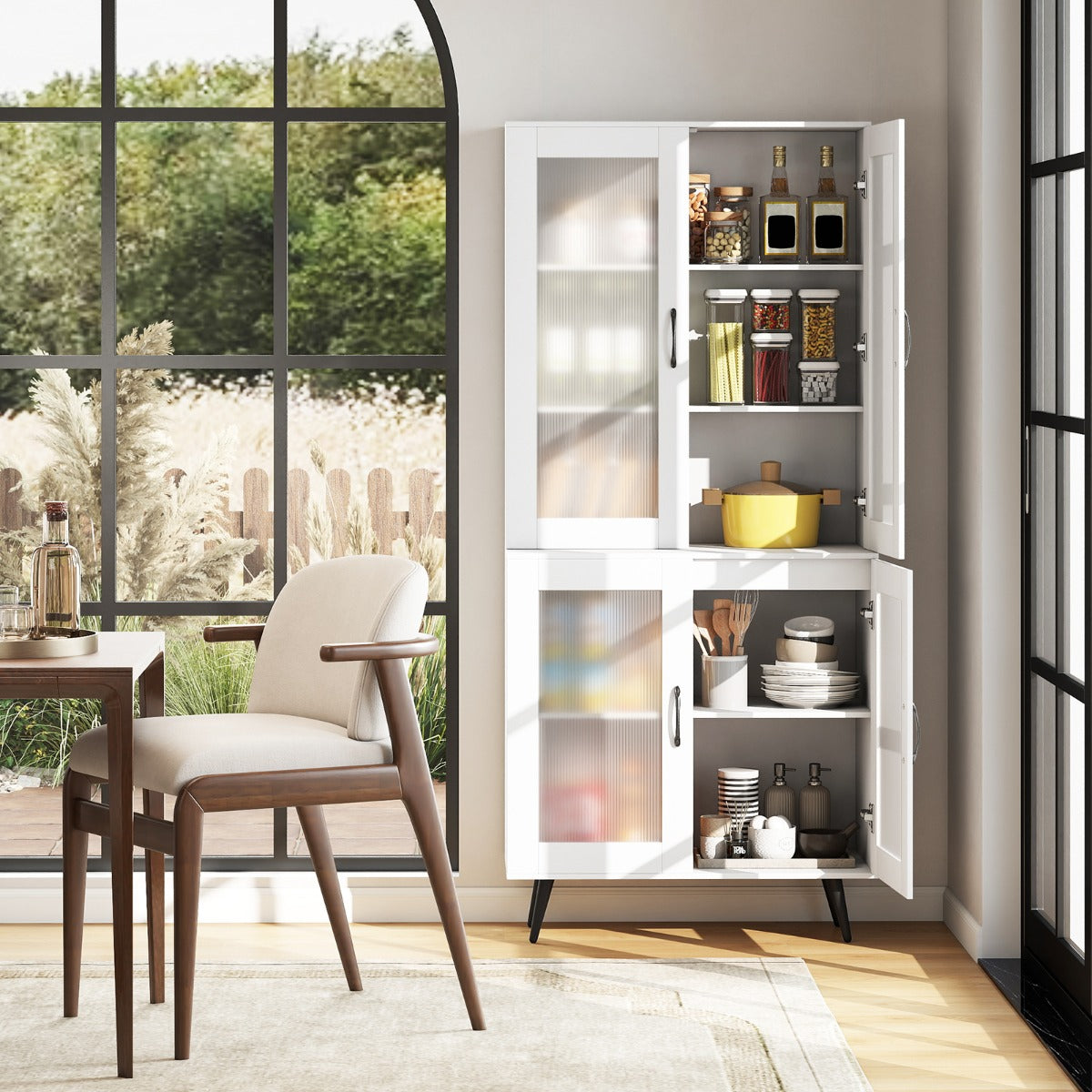 - Solução de Armazenamento Perfeita: Este armário despensa possui 4 portas que se abrem para revelar um interior espaçoso, perfeito para armazenar uma variedade de utensílios de cozinha e louça. Além disso, as portas transparentes permitem ver e aceder facilmente aos artigos.