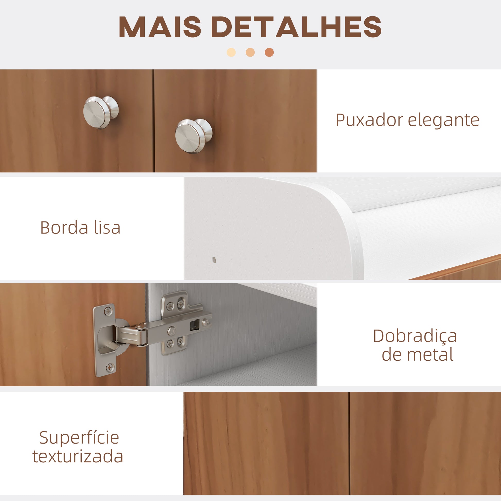 - Materiais: Fabricado em aglomerado de madeira E1 de 15 mm com acabamento em melamina, borda de PVC e textura de grão de madeira.