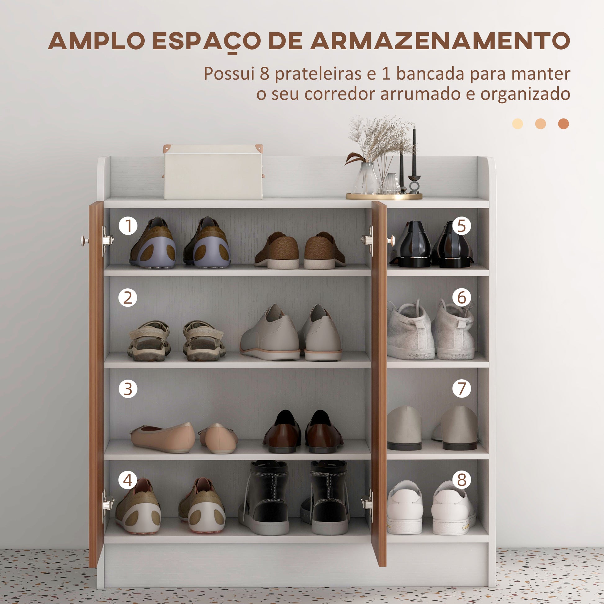 - Benefícios: Portas duplas para proteger os objetos da poeira, prateleiras ajustáveis em altura, resistente e fácil de limpar.