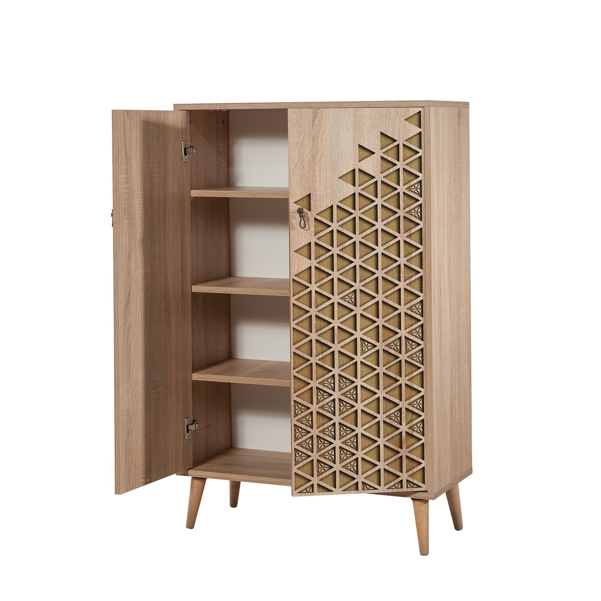 Fabricado a partir de painéis de partículas 100% revestidos a melamina, este armário foi concebido para durar. A espessura de 18 mm garante robustez e estabilidade, enquanto as pernas em viga de chifre proporcionam um apoio adicional. Os puxadores em metal e corda dão um toque de elegância, tornando-o numa peça de destaque em qualquer ambiente.