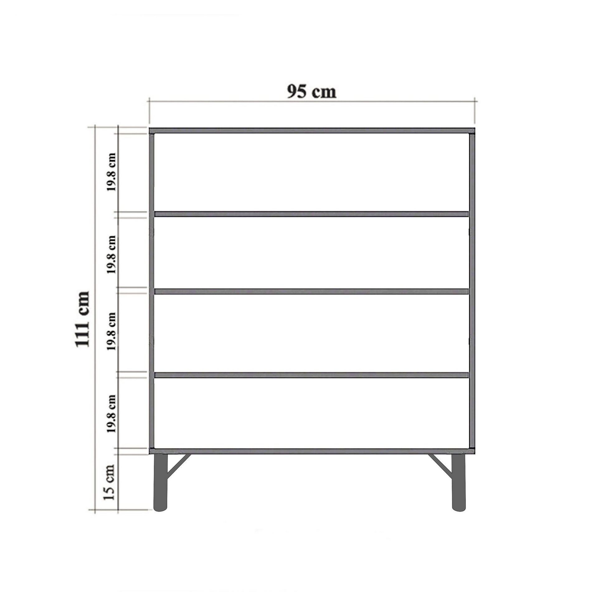 Com uma largura de 95 cm, altura de 111 cm e profundidade de 36 cm, este armário oferece amplo espaço de armazenamento sem ocupar muito espaço. A espessura de 18 mm do painel garante solidez, enquanto a altura das pernas de 15 cm adiciona um toque elegante ao design. As numerosas prateleiras oferecem muitas opções de armazenamento, e a altura da prateleira de 19,8 cm permite uma fácil organização de seus pertences.