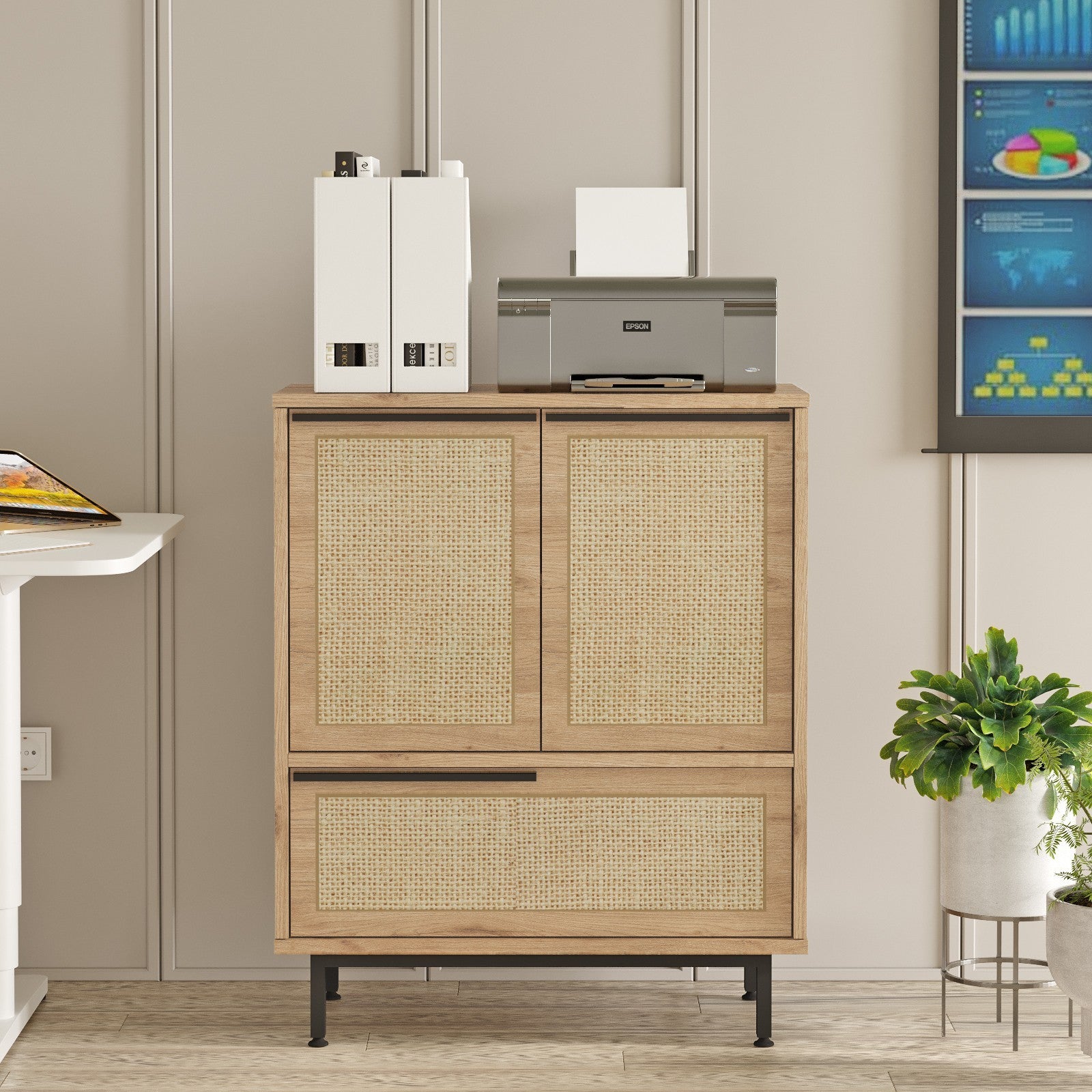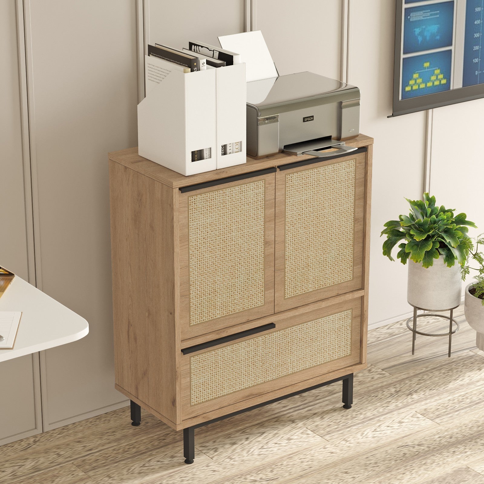 Diga adeus às bancadas desordenadas e às prateleiras desarrumadas. O nosso armário multifunções oferece um amplo espaço de arrumação para manter os seus pertences bem organizados. Desde livros e álbuns de fotografias a artigos essenciais de cozinha e material de escritório, este armário pode acomodar tudo. As prateleiras ajustáveis permitem-lhe personalizar a arrumação para se adaptar perfeitamente às suas necessidades.