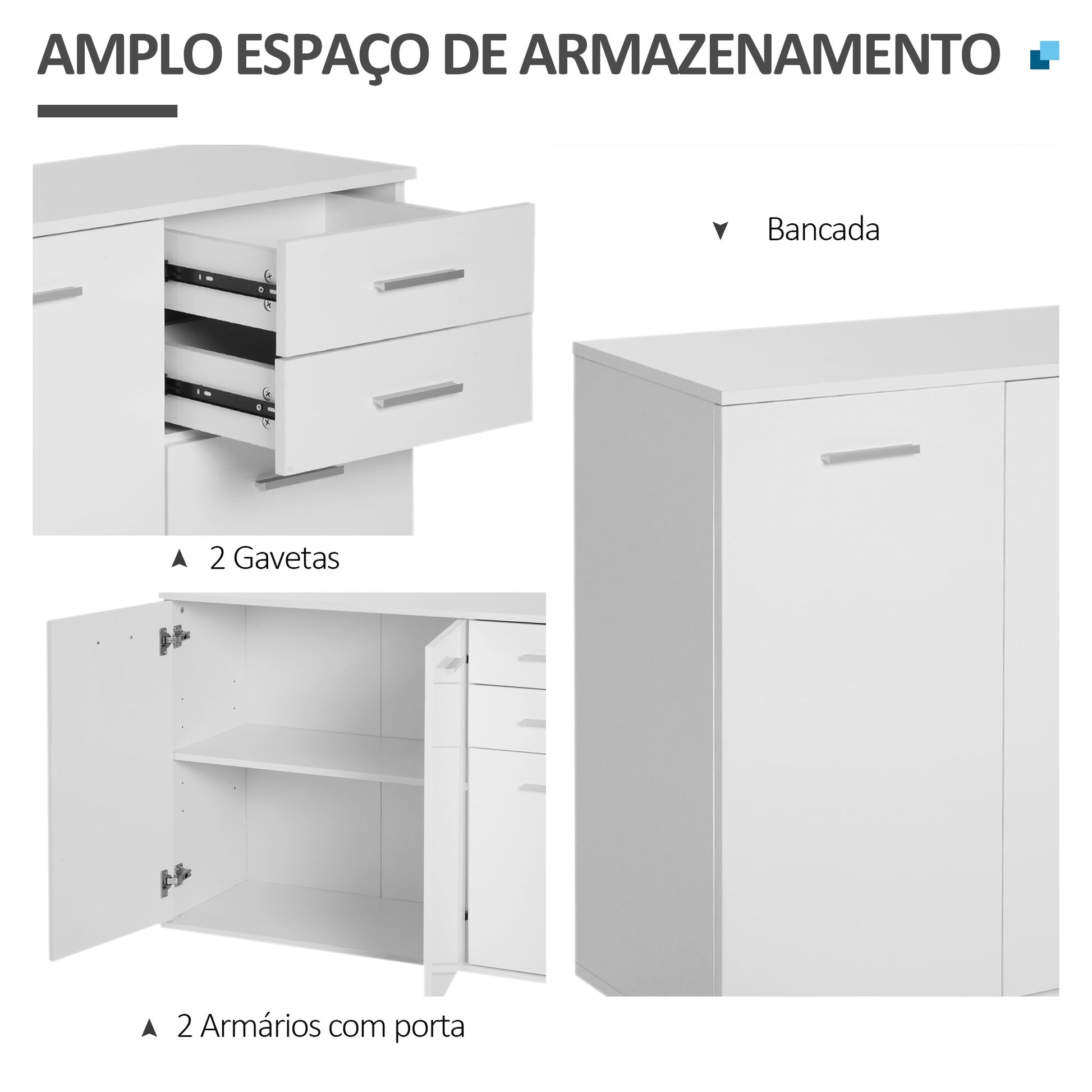 - Benefícios: Espaçoso, com duas gavetas e três gabinetes com portas de tamanhos diferentes. Prateleira ajustável no gabinete esquerdo.