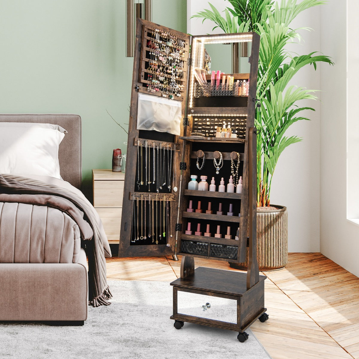Este versátil armário de joalharia 3 em 1 é a solução perfeita para organização e rotina diária. O armário de pé possui dois espelhos: um de corpo inteiro e outro de maquilhagem incorporado. O espelho de maquilhagem é rodeado por luzes LED de 3 cores, e a prateleira dobrável adiciona conveniência durante a aplicação de maquilhagem. Equipado com ganchos, fendas, prateleiras, gavetas e muito mais, este organizador de joalharia e cosméticos mantém todos os seus essenciais em ordem. Além disso, o espelho de corpo inteiro é ajustável em 3 ângulos, e as rodas universais bloqueáveis proporcionam grande flexibilidade de movimento.