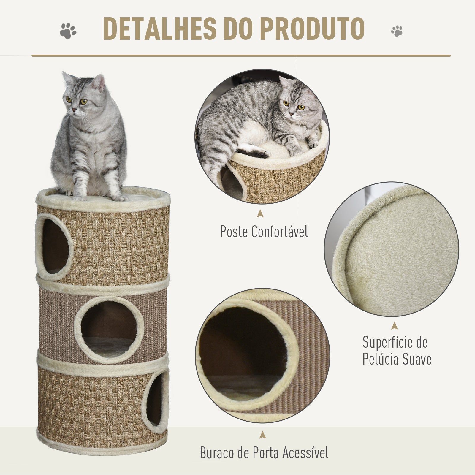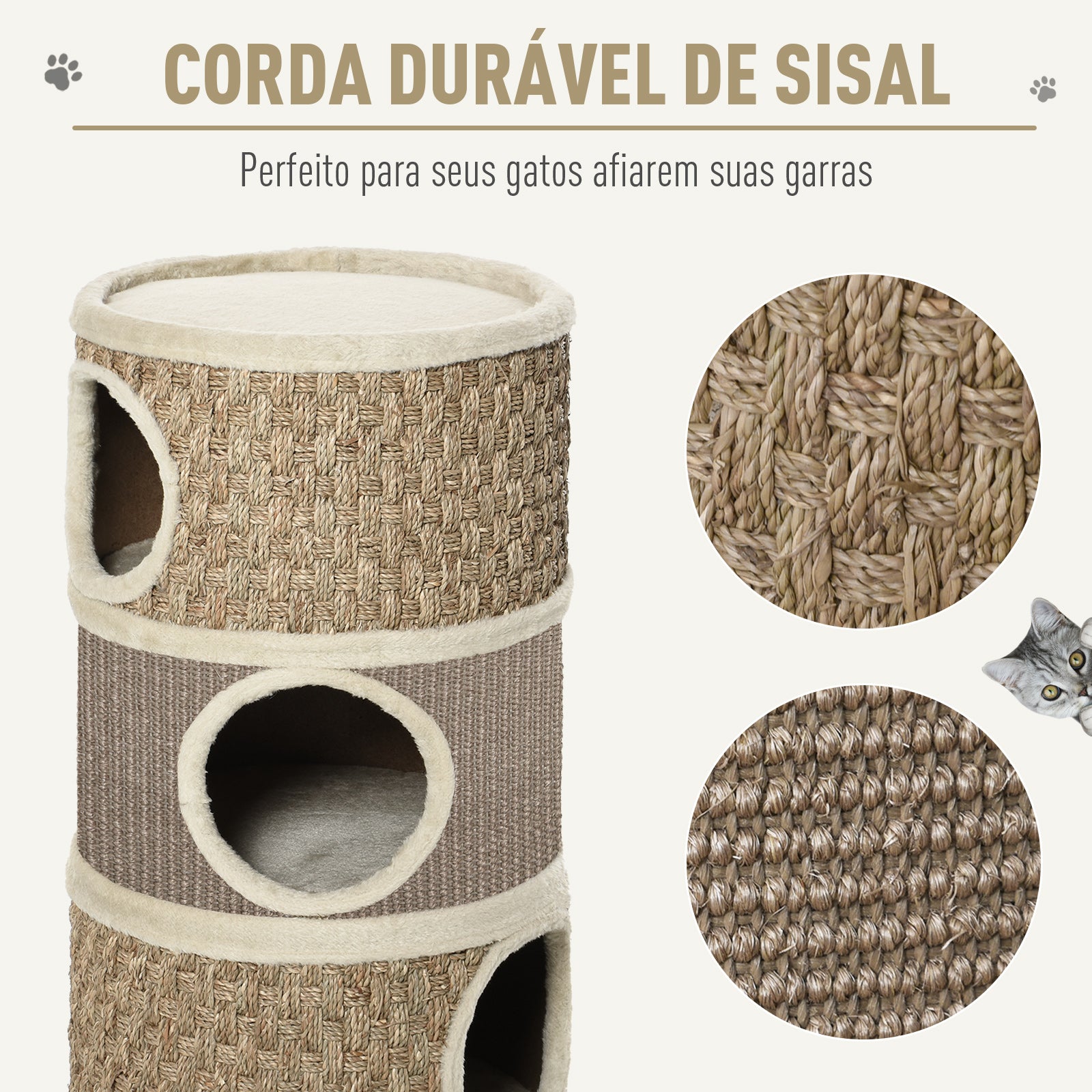 - Benefícios: Estrutura resistente e segura, revestimento de sisal para afiar as unhas do gato, design moderno que combina com a decoração da casa