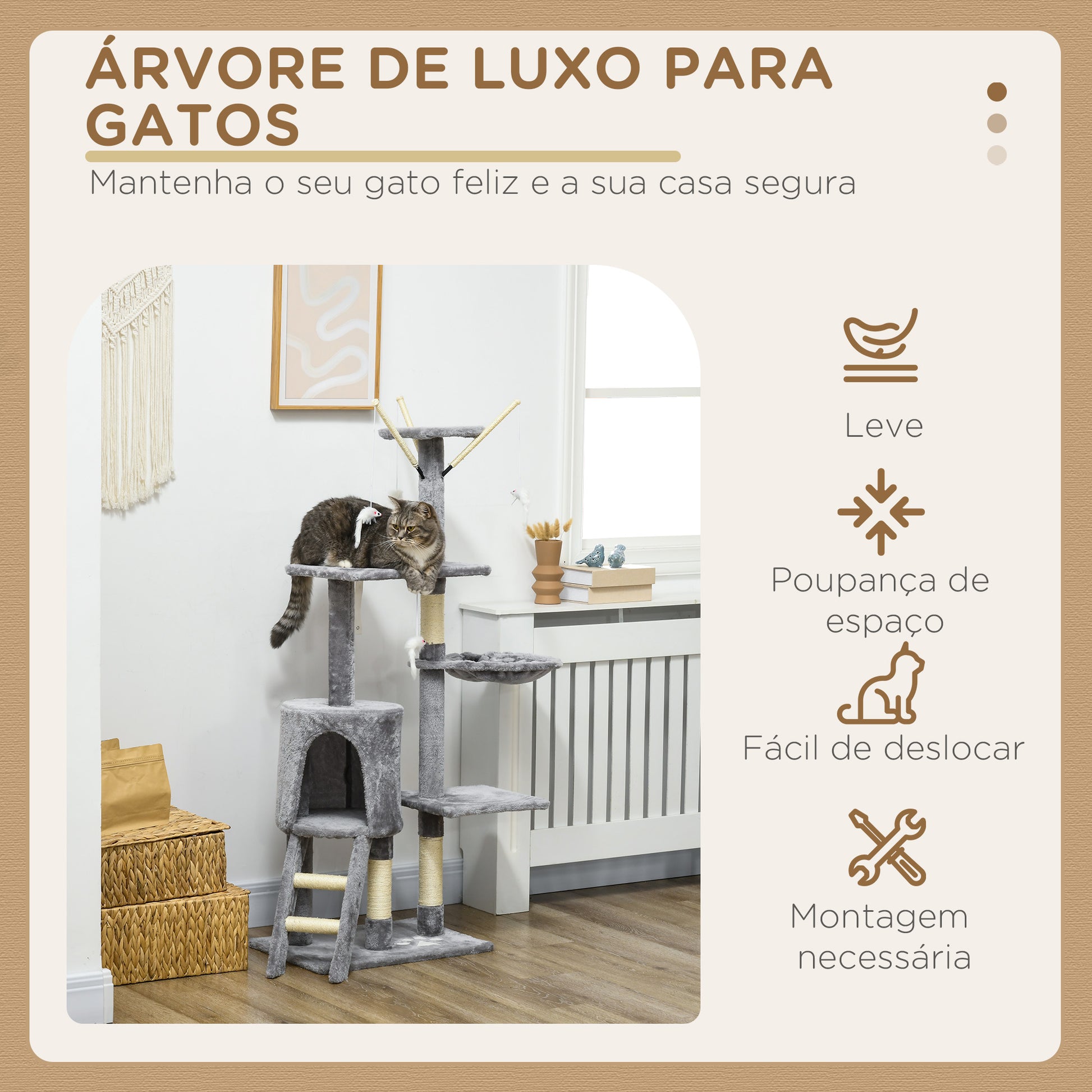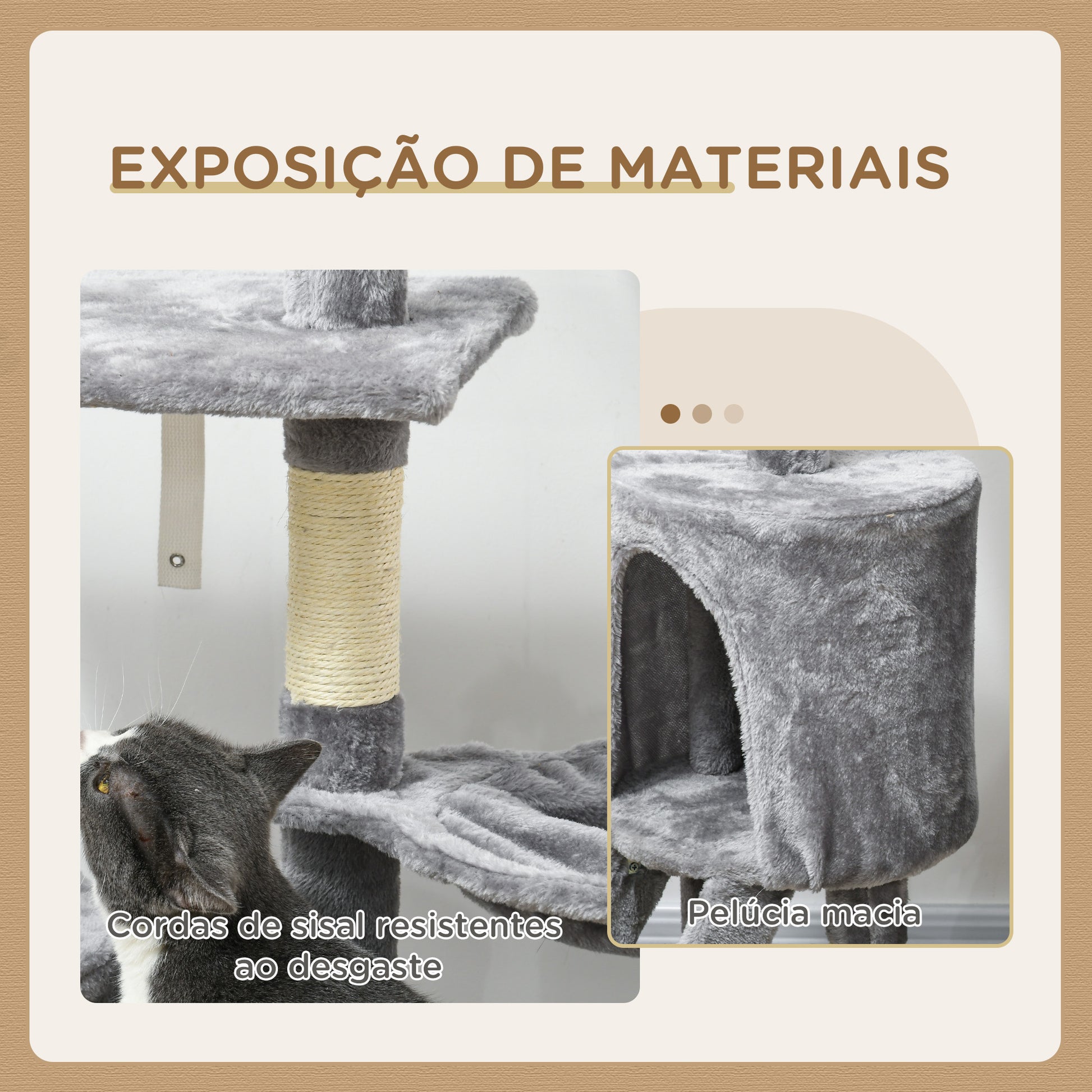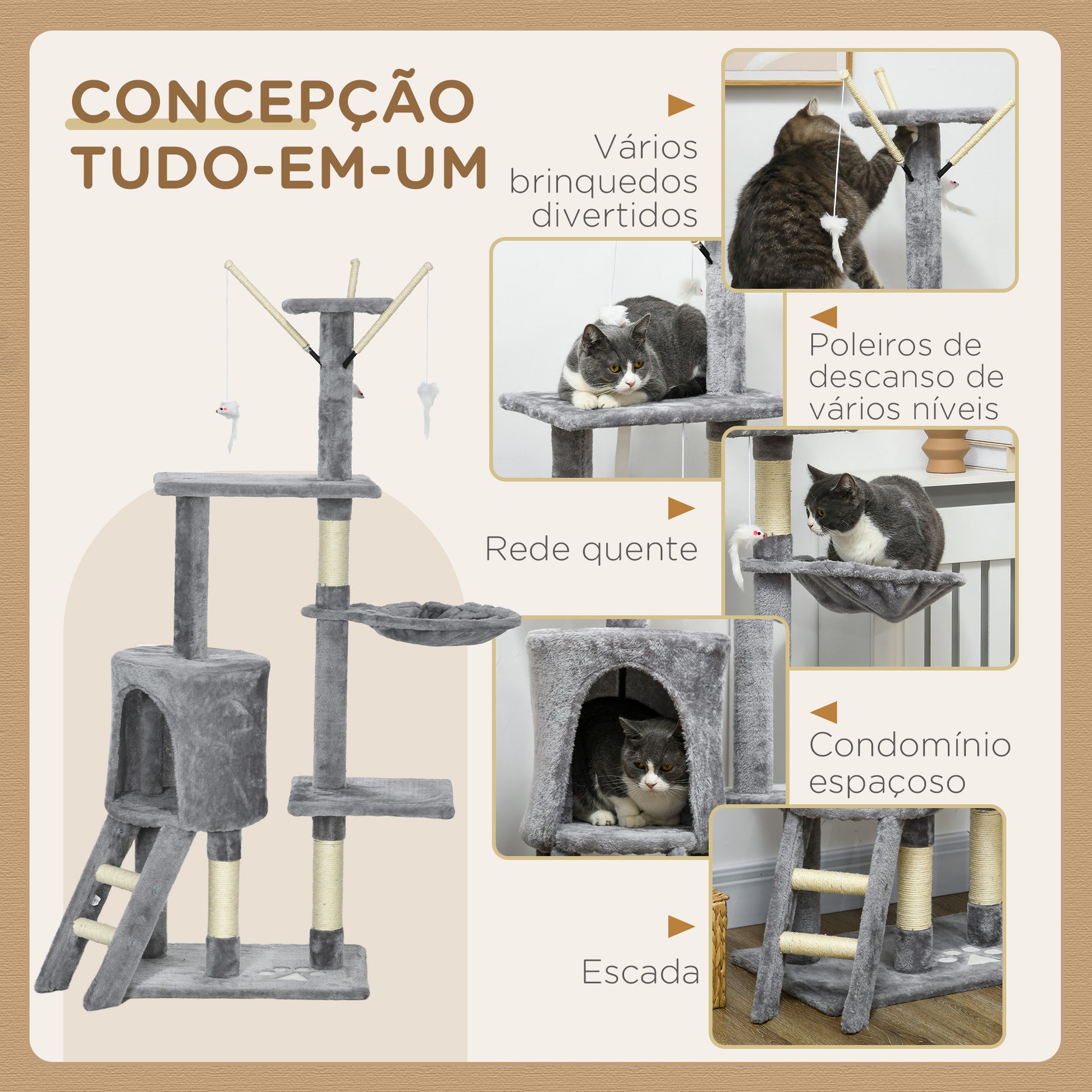 - Benefícios: Centro de atividades para gatos com postes de sisal, caverna, rede, escada e brinquedos de rato pendurados