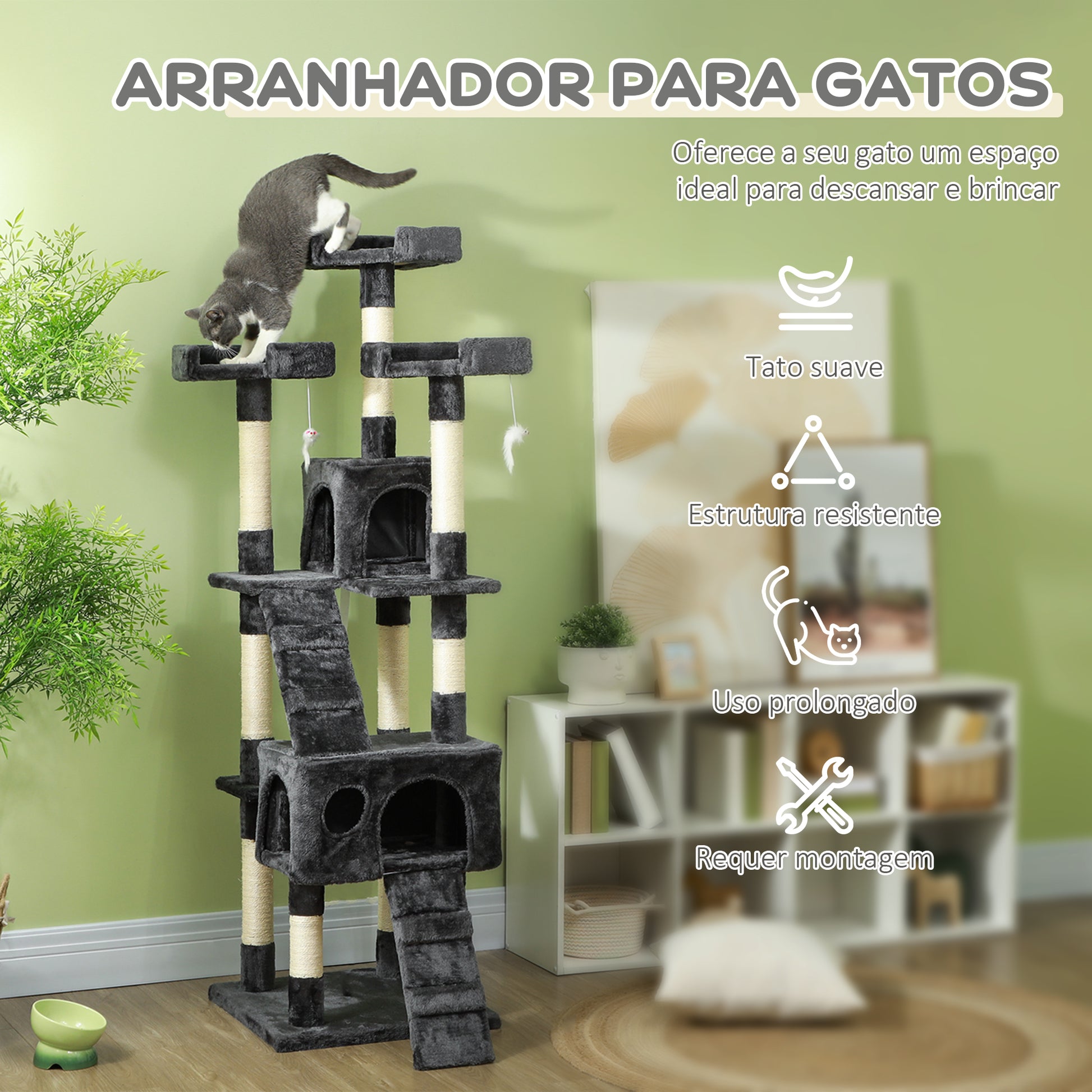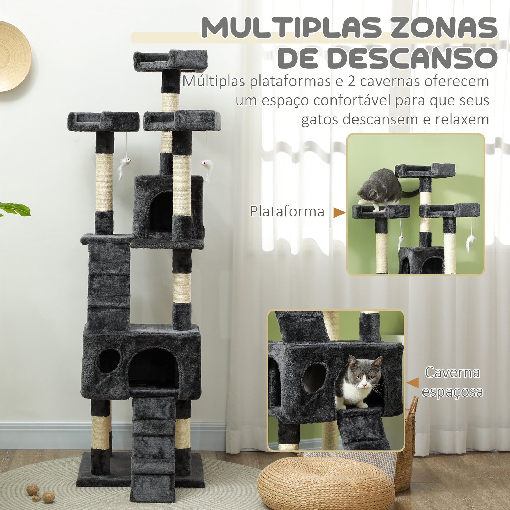 Arranhador para Gatos Grande 49x49x173 cm Cinzento Multinível com Cavernas e Brinquedos Suspensos