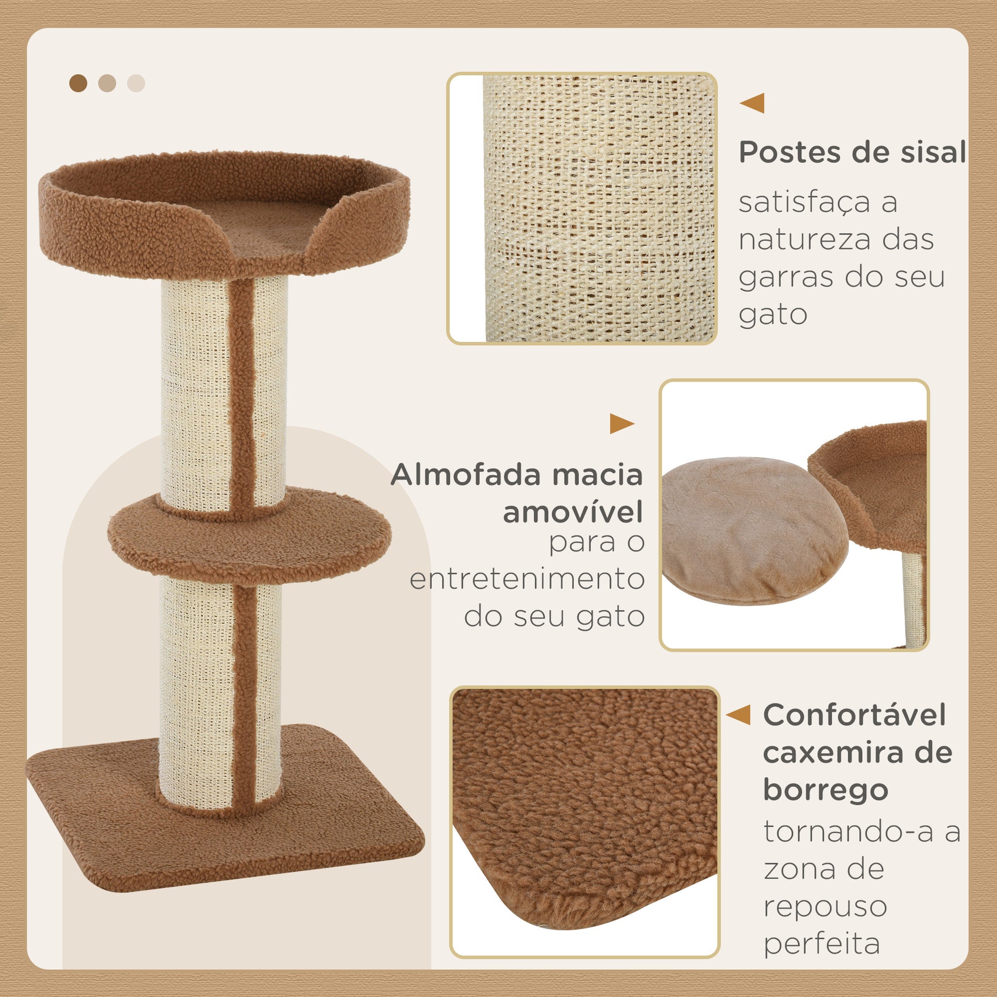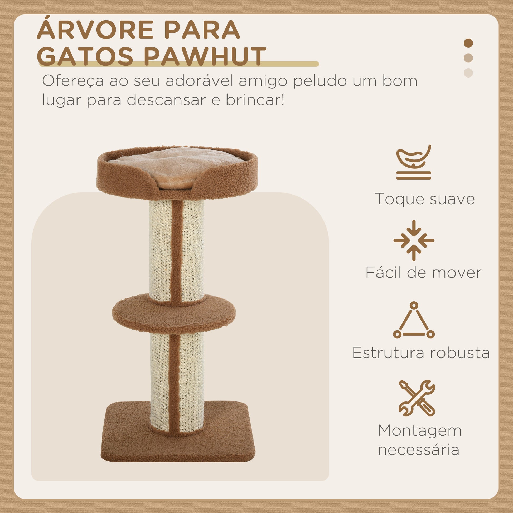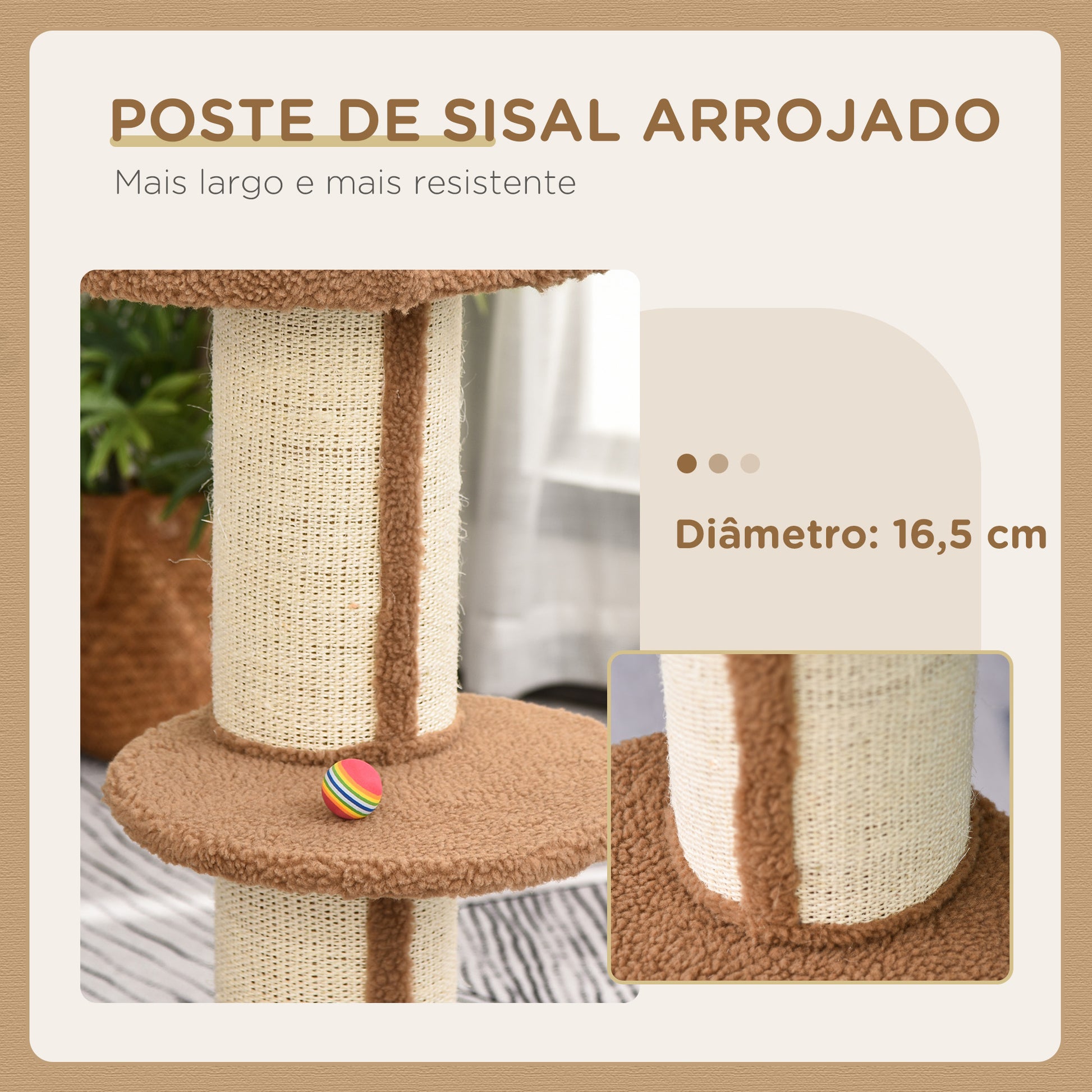 - Benefícios: Cobertura macia em pelúcia marrom claro, estrutura resistente, poste de sisal para afiar as garras