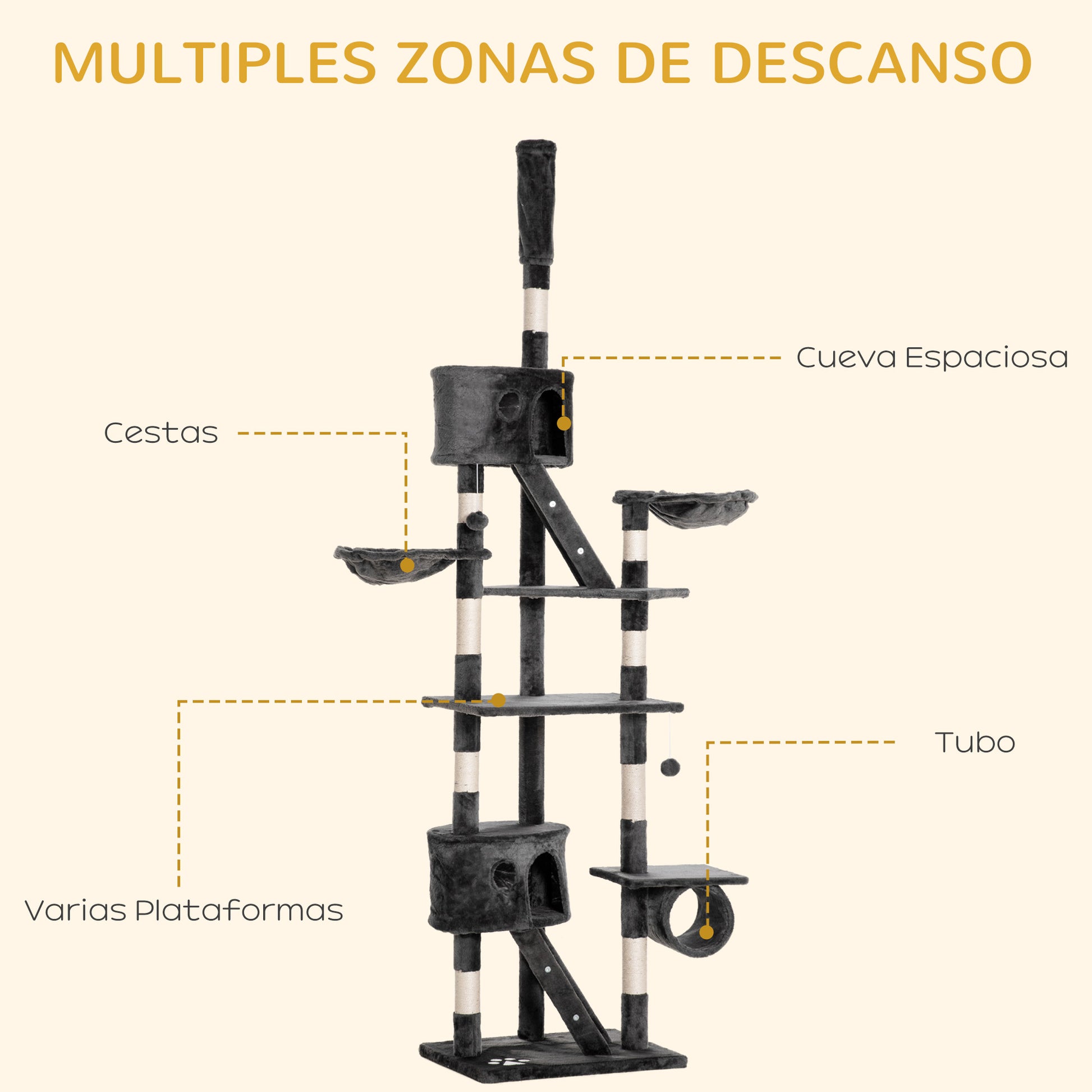 Procura uma árvore de arranhar completa para o seu gato? Esta árvore cinza escuro com medidas de 60x45x260 cm é a solução ideal para o entretenimento do seu felino.