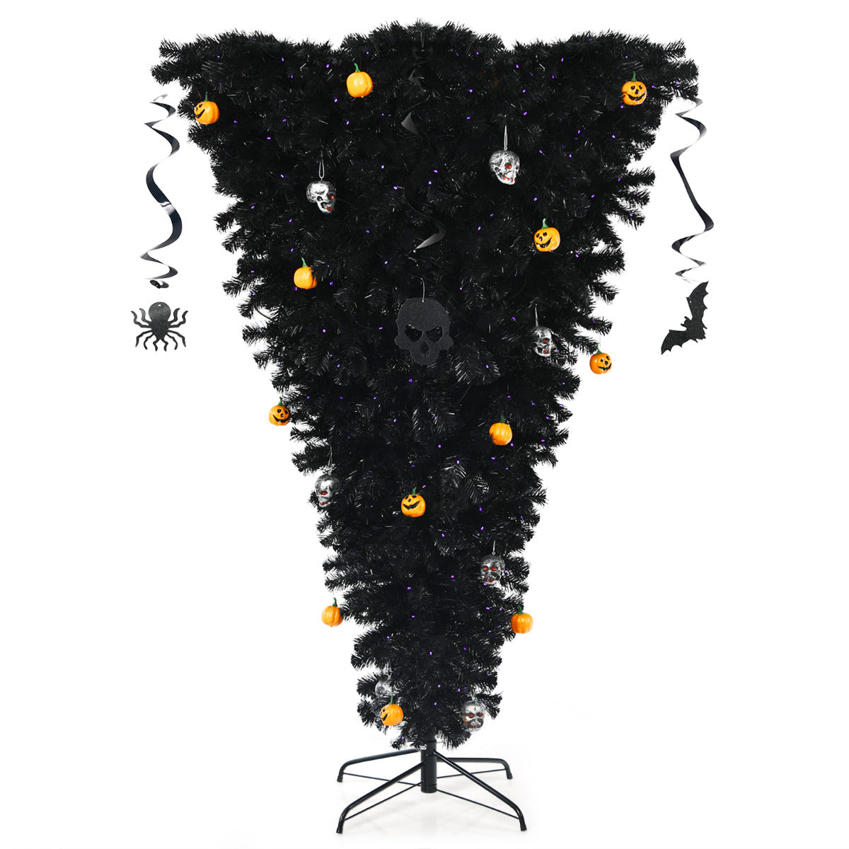 A árvore artificial negra está virada para baixo e possui luzes violeta para criar uma atmosfera assustadora e misteriosa. Feita de PVC, com 810 ramos, 270 luzes LED de alta qualidade certificadas UL e base de metal dobrável, este luxuoso pinheiro de Natal não serve apenas para celebrar o Natal, Halloween e outras festas, mas também como decoração para casas, escolas, escritórios e outros locais, evidenciando o teu sentido estético e criativo. Oferece efeitos ilimitados em espaços limitados.