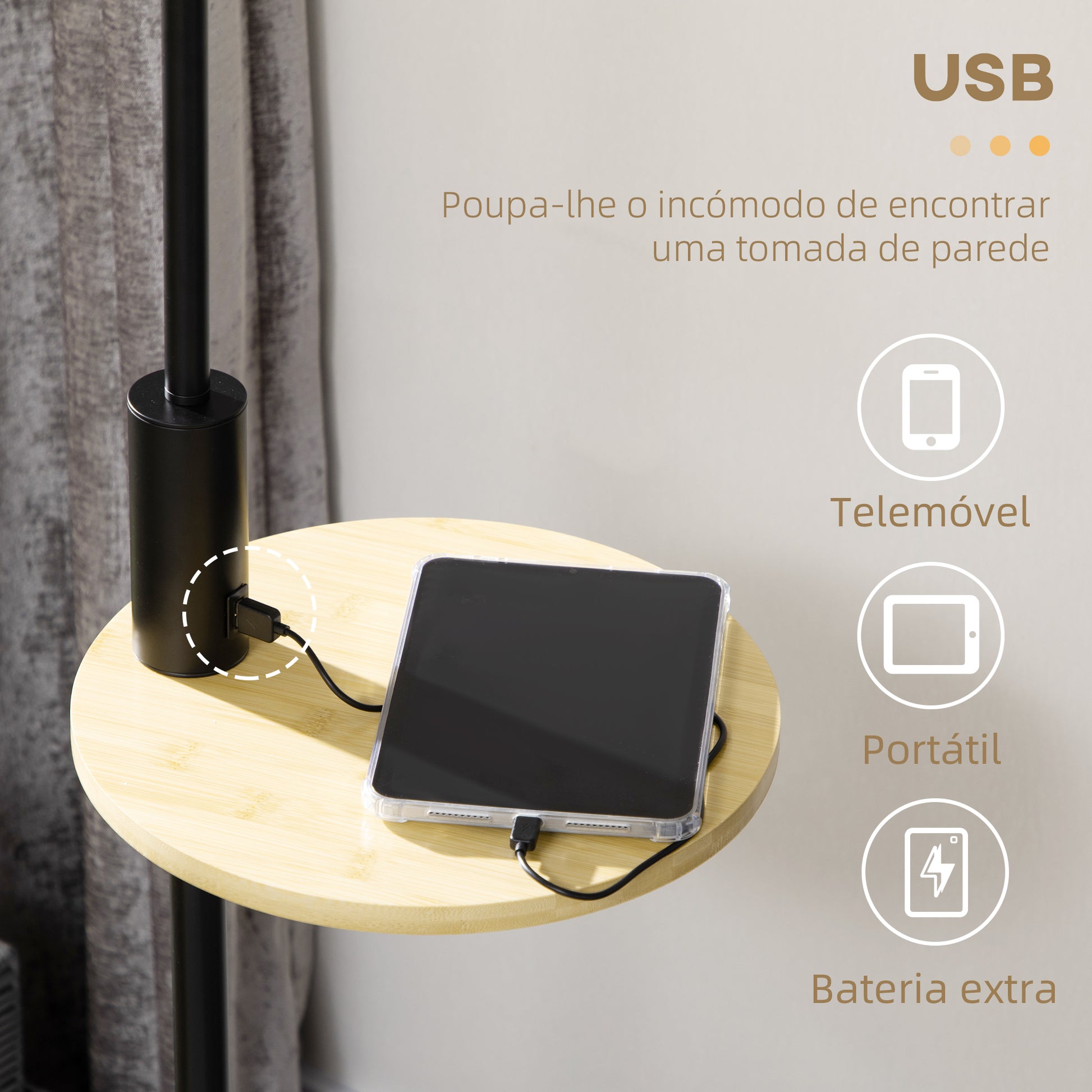 Candeeiro de Pé com Prateleira e Carregador USB – Ø40x168cm – Preto e Madeira
