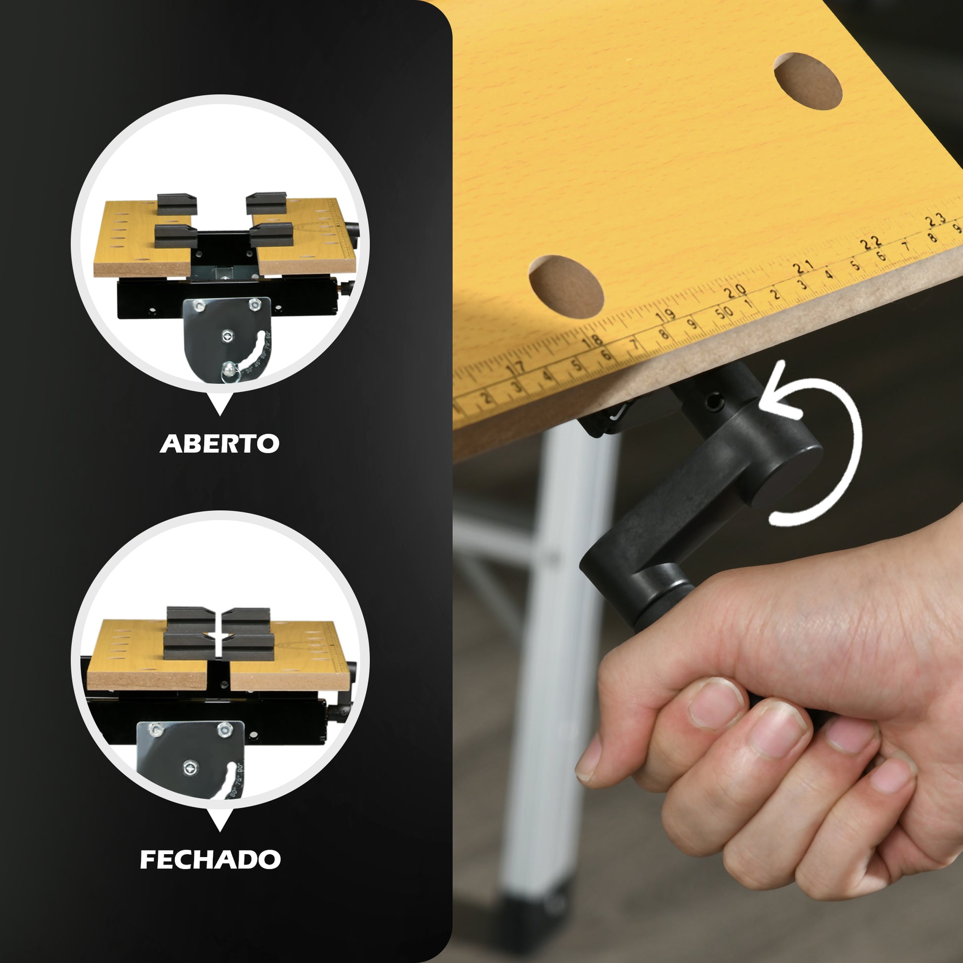 - Outras Especificações Relevantes: Inclui 4 pinos giratórios ajustáveis, mesa com régua e transferidor, pés de PVC antiderrapantes e barras de amarração para armazenar ferramentas.