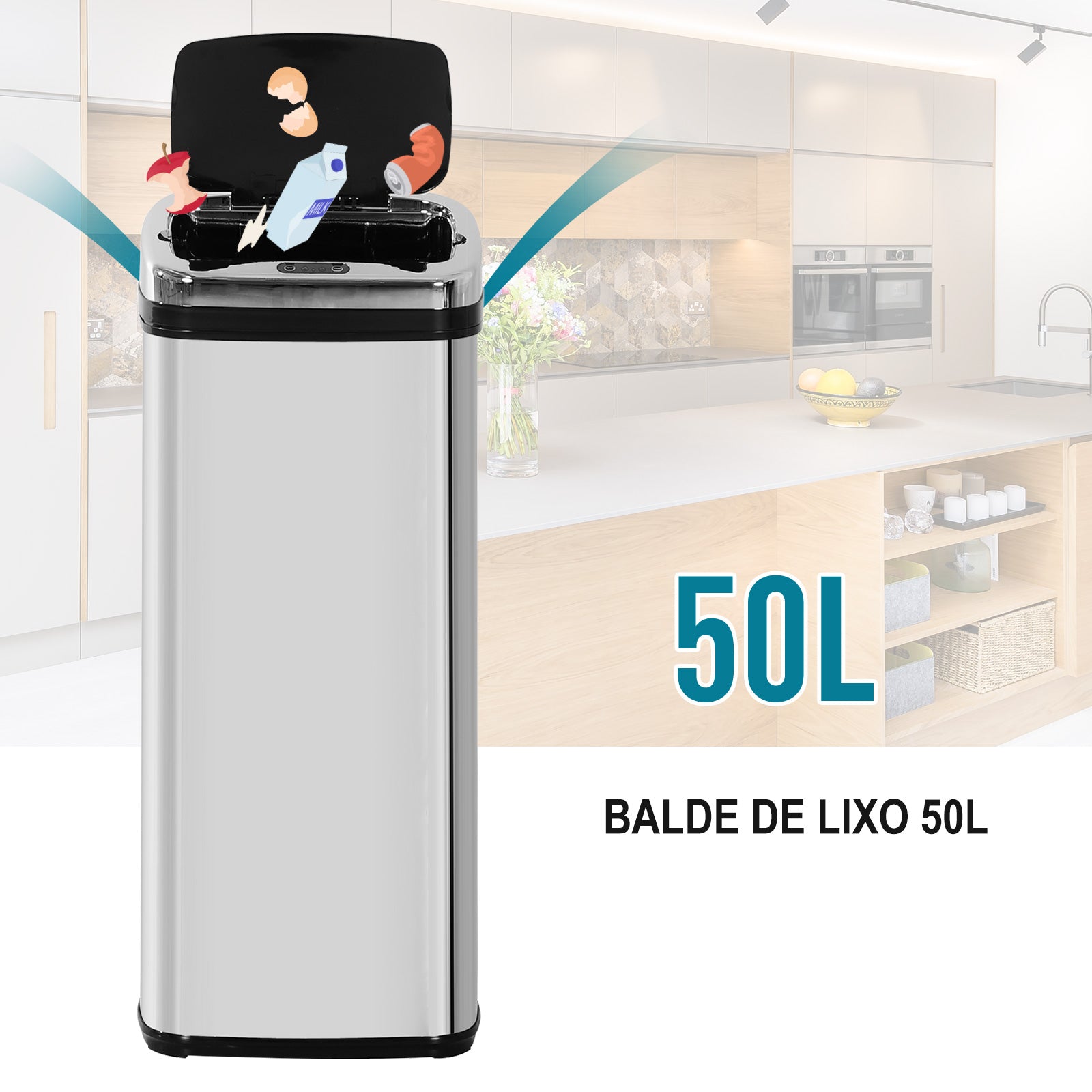 Este balde de lixo automático de 50 litros em aço inoxidável é um auxiliar elegante e funcional para a sua casa. Com abertura automática por sensor infravermelho, torna o descarte de resíduos mais higiênico e conveniente.