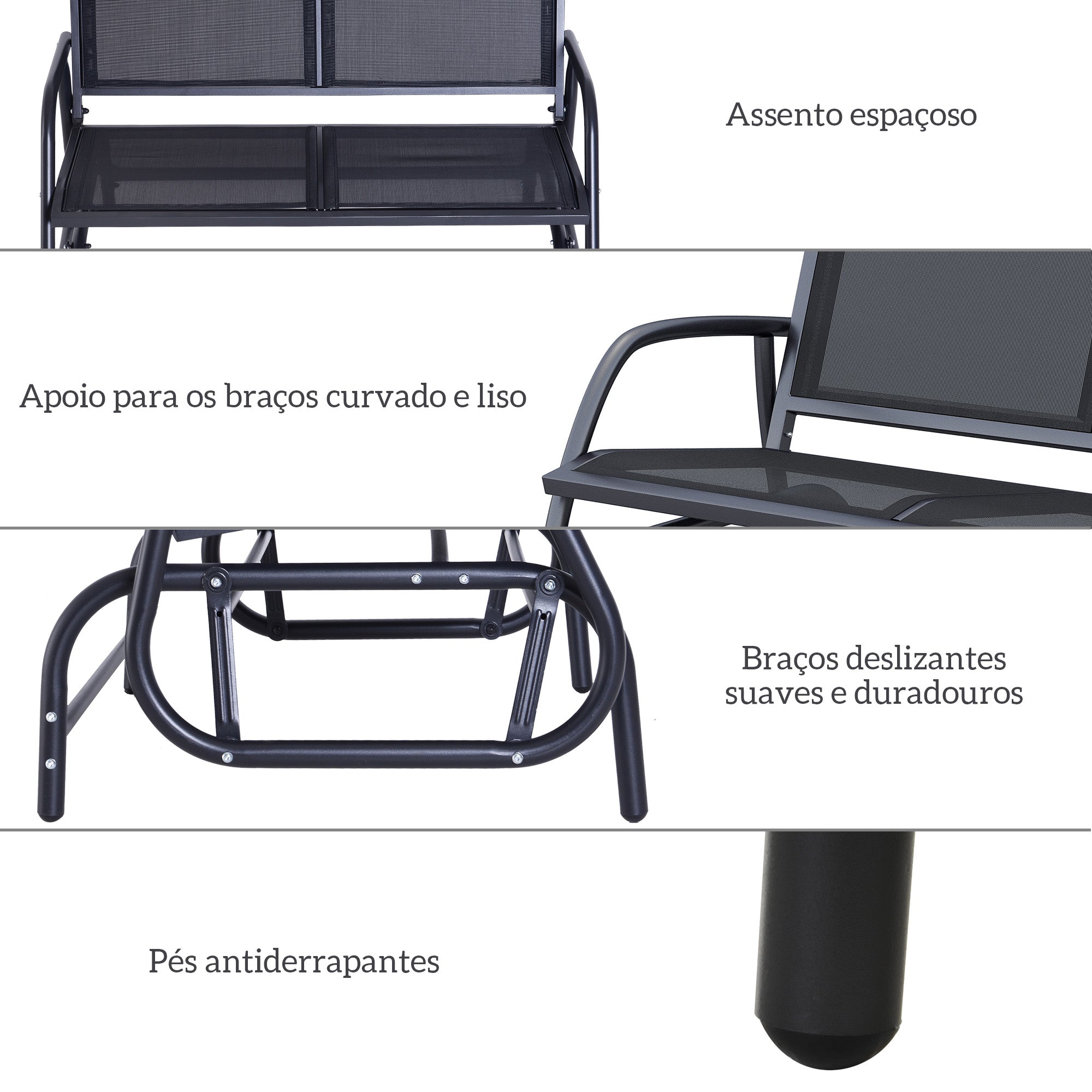 - Benefícios: Suporta até 200 kg, estrutura estável e resistente à ferrugem, apoios de braços curvados para conforto, assento e encosto largos para duas pessoas