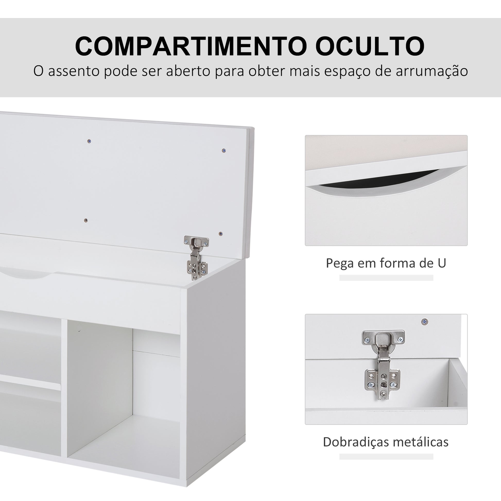 - Outras especificações: Capacidade máxima de 8 pares de sapatos, suporta até 120 kg de peso, inclui uma gaveta por baixo do assento para armazenamento adicional.
