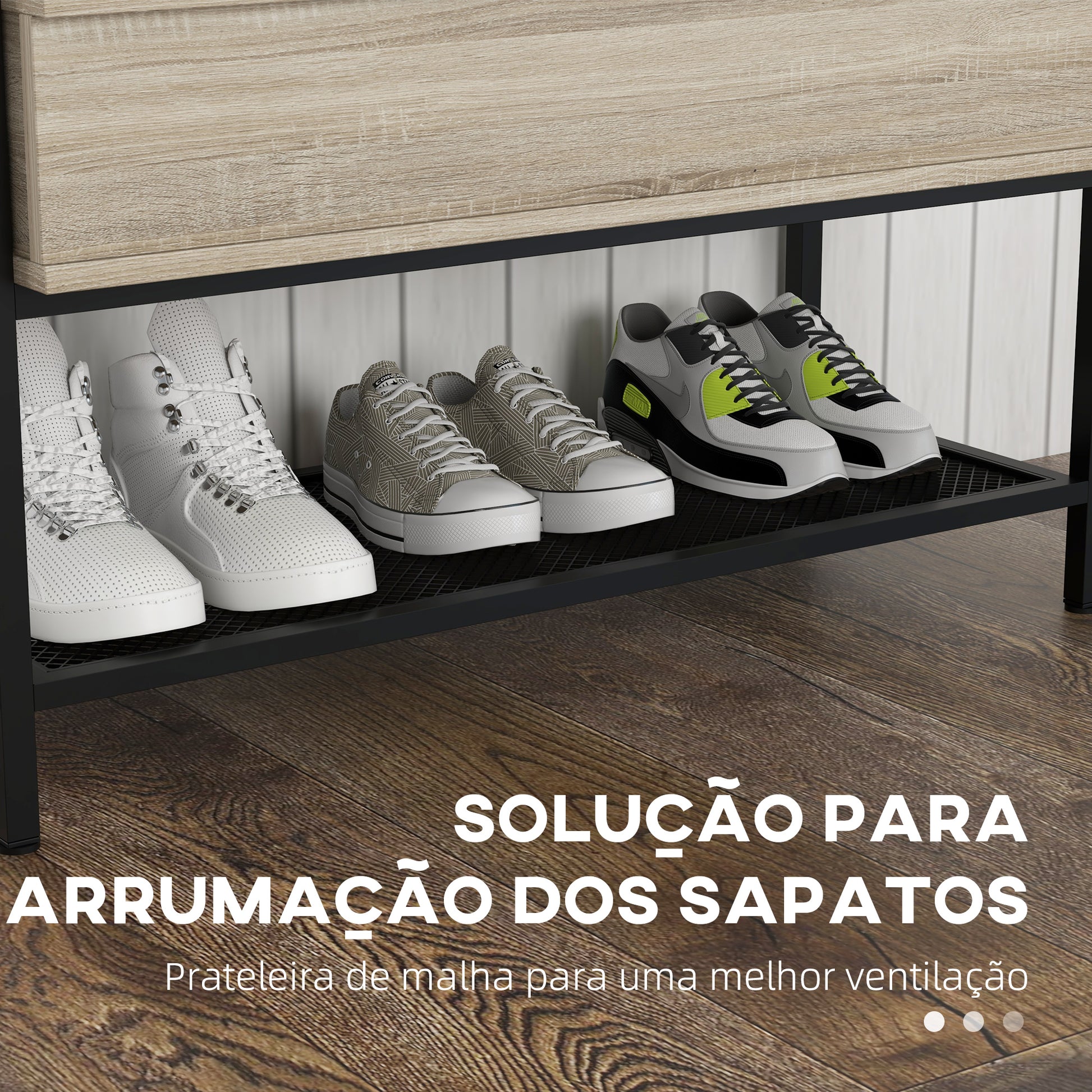 Organize os seus sapatos com este banco sapateira moderno. Com espaço oculto para pequenos objetos e prateleira de malha para 4 pares de sapatos.
