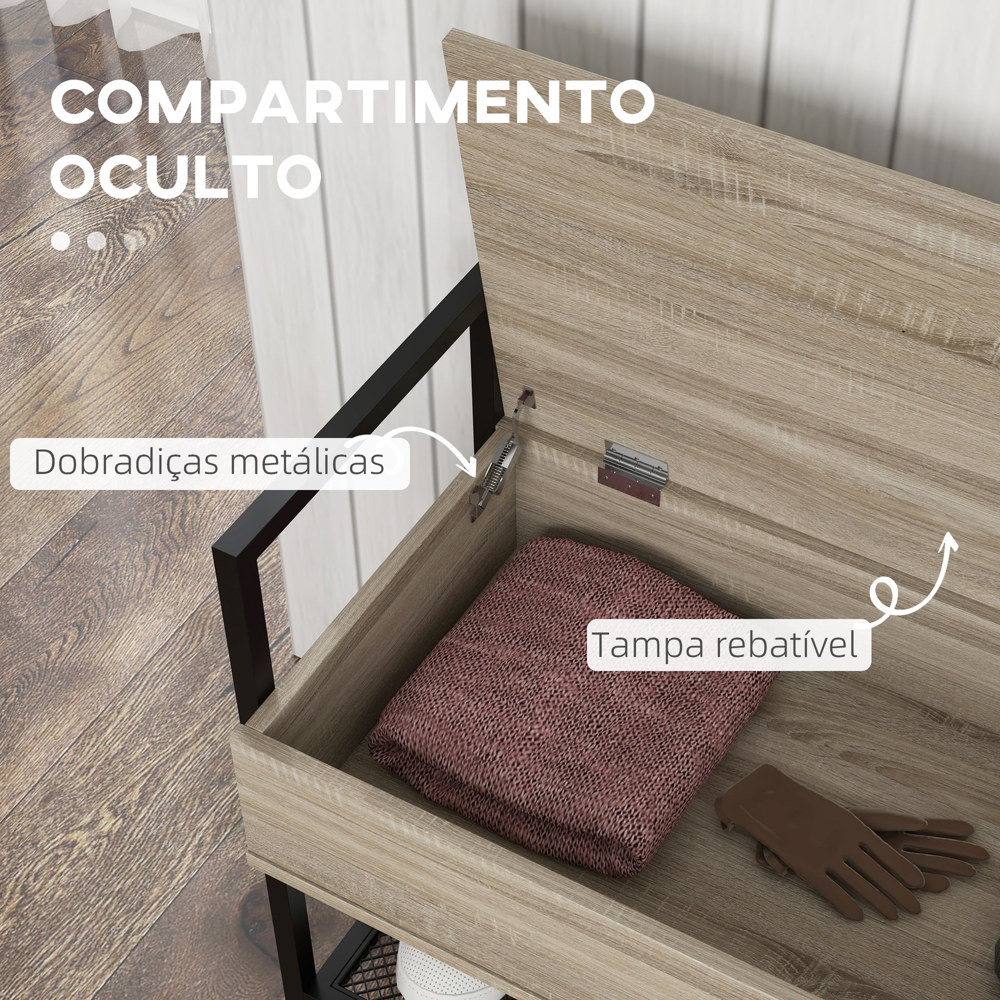 - Especificações: Assento 80x39,5x48 cm, compartimento oculto 38x35x12 cm, prateleira inferior 80x38x23 cm