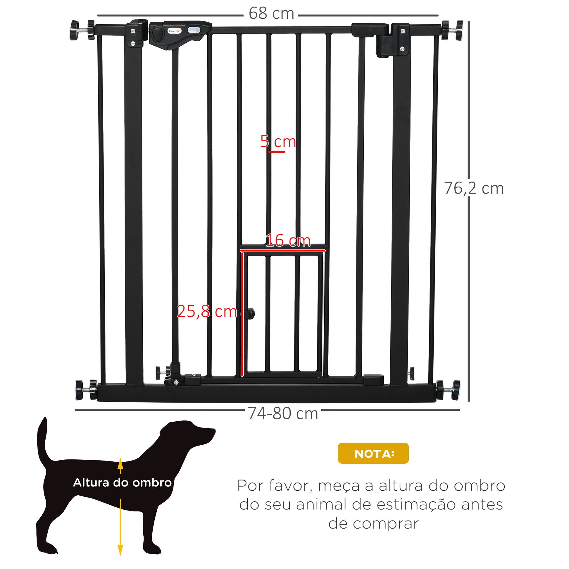 - Outras especificações relevantes: Faixa de largura de 74 a 80 cm, espaço entre as barras laterais de 5 cm, largura de abertura de 50 cm, medidas da portinha de 16x25,8 cm