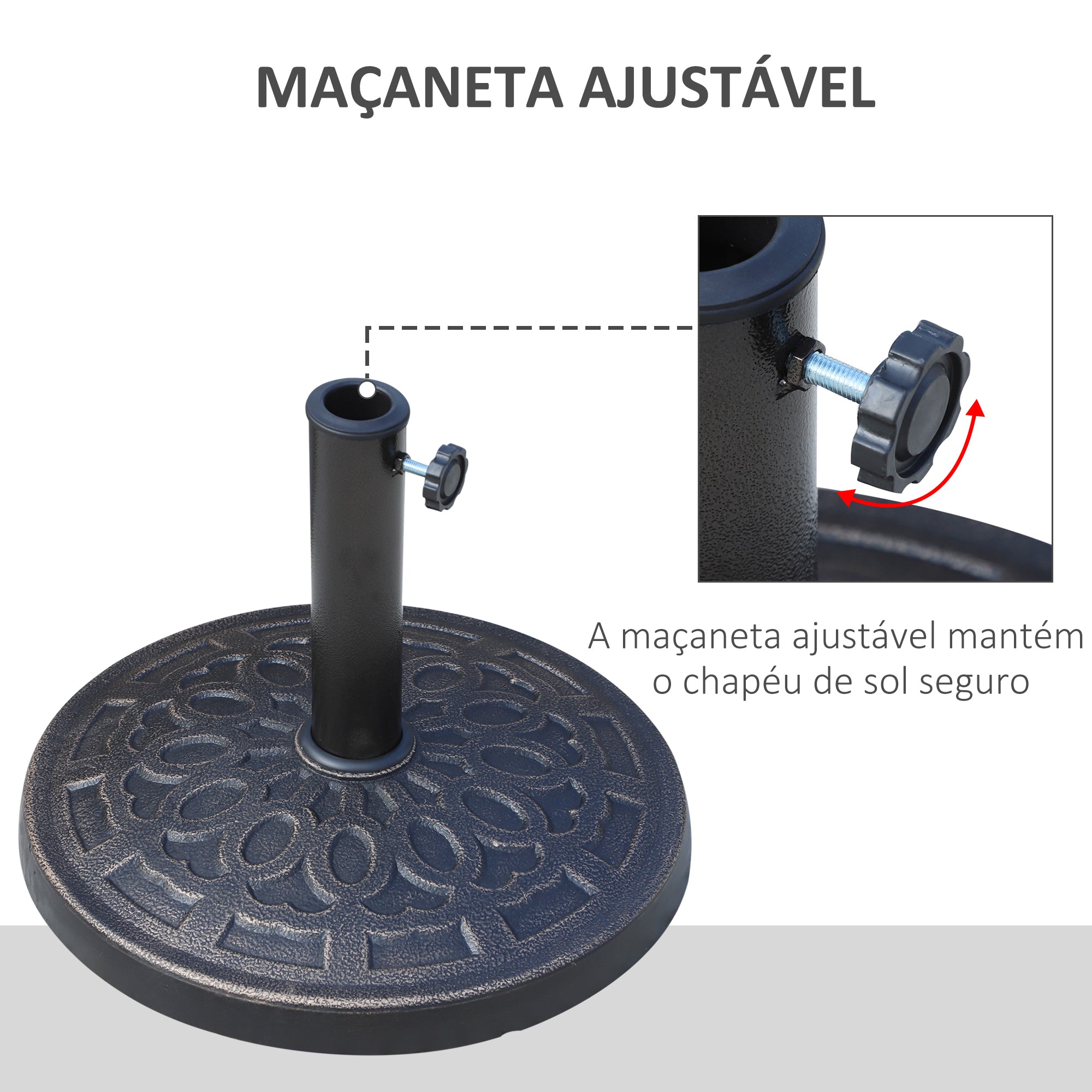 Garanta estabilidade e elegância ao seu chapéu de sol com esta base circular em resina resistente, ideal para mastros de 38mm e 48mm de diâmetro.