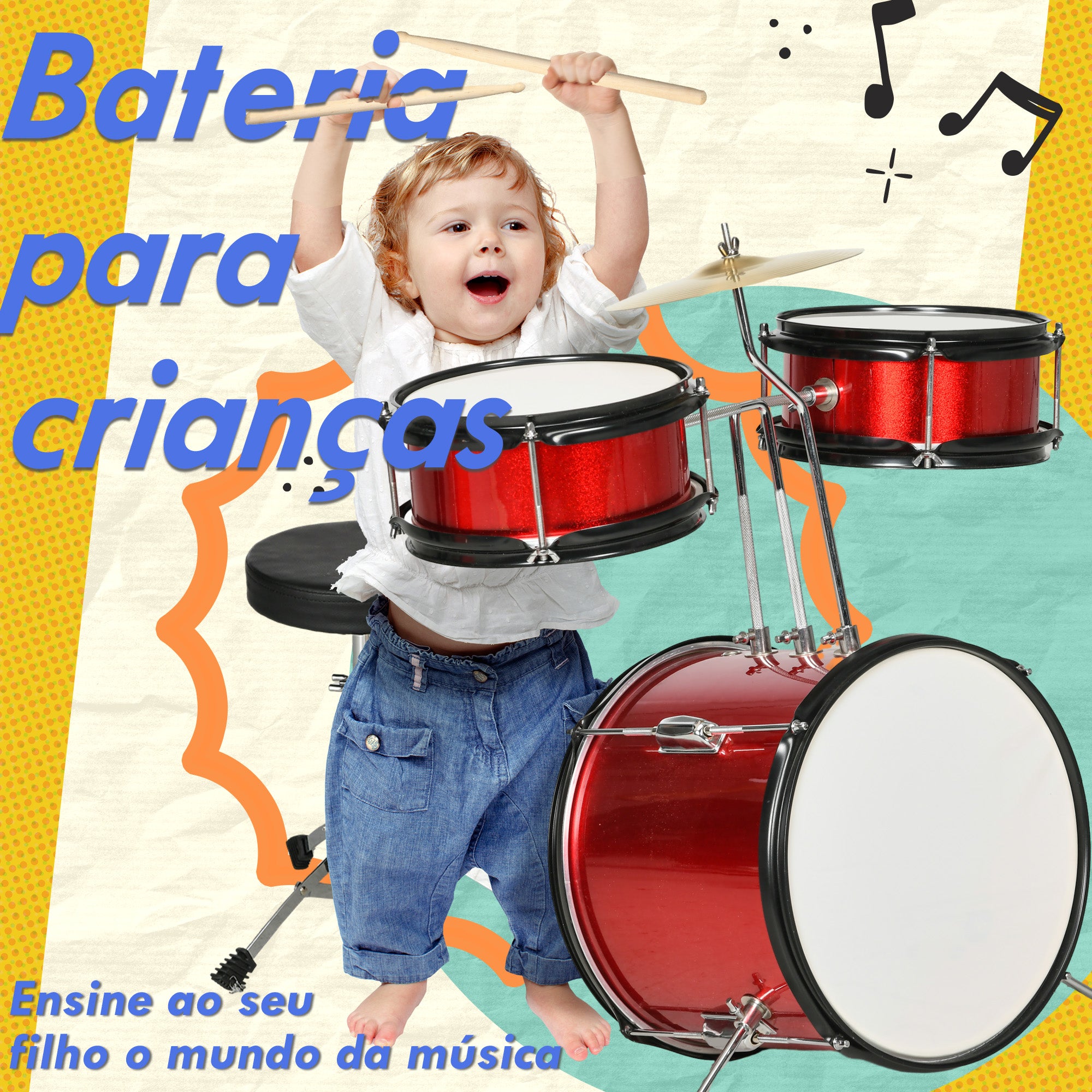 Este kit de bateria de brinquedo é perfeito para introduzir as crianças no mundo da música, promovendo o gosto pelo ritmo desde cedo. Proporcione uma experiência de jogo divertida e educativa com este conjunto de bateria infantil.
