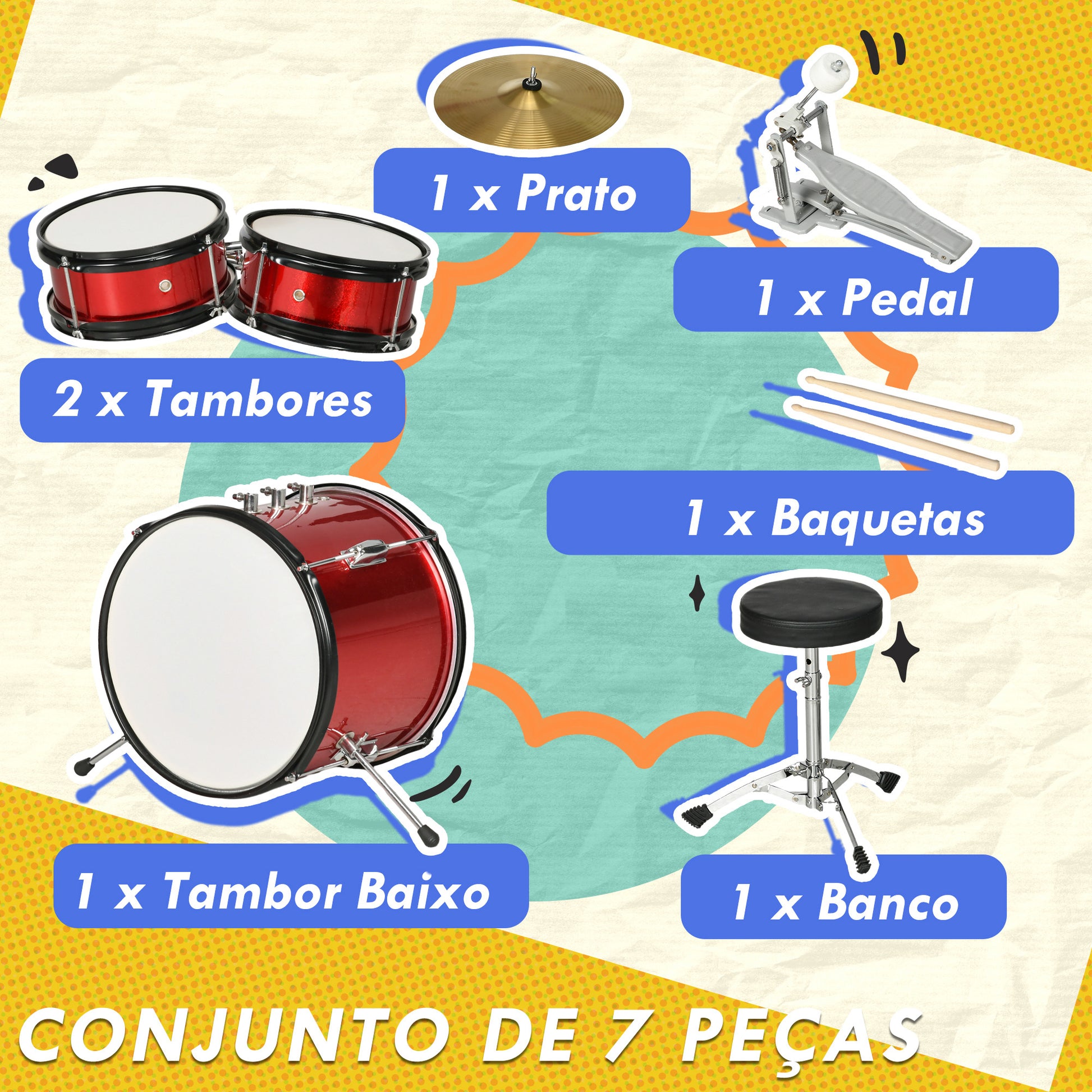 Este kit de bateria para crianças é perfeito para os pequenos bateristas iniciarem a sua jornada musical. Com medidas de 80x60x48-65 cm e na cor vermelha, este conjunto completo inclui 2 tambores, 1 bombo, 1 trono de tambor, 1 prato, 1 pedal de bombo e um par de baquetas de madeira.