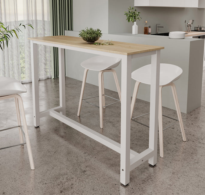 - Materiais da mesa alta: Tabuleiro melamínico mate, Pernas metálicas lacadas a branco brilhante