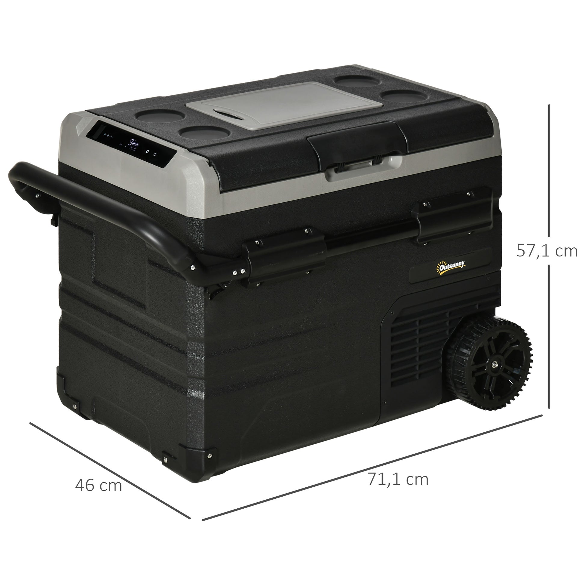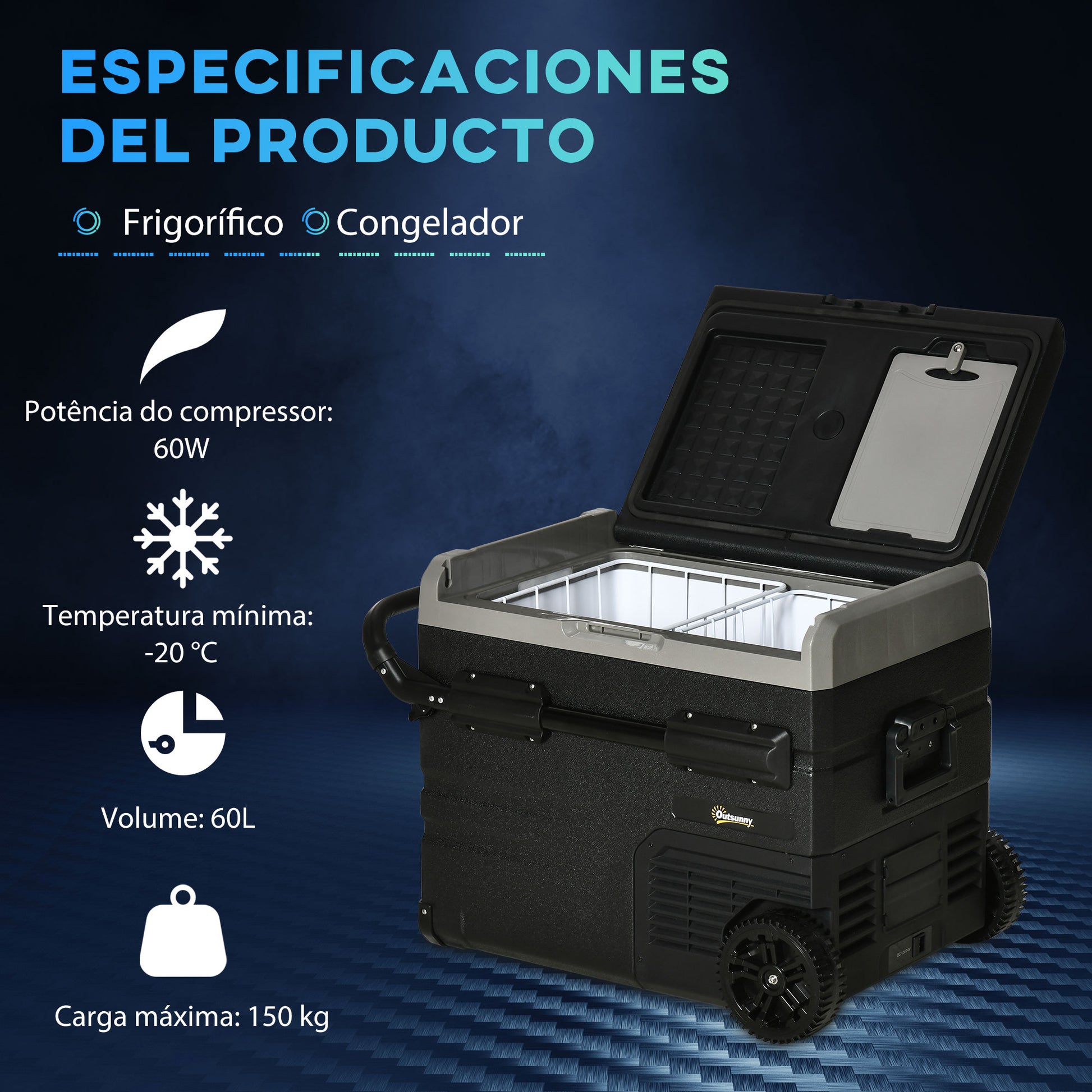 Esta geleira portátil é a solução ideal para manter os seus alimentos e bebidas frescos em qualquer lugar. Com uma capacidade de 60 litros e medidas de 71.1x46x57.1 cm, oferece refrigeração eficaz e até -20°C de temperatura mínima.