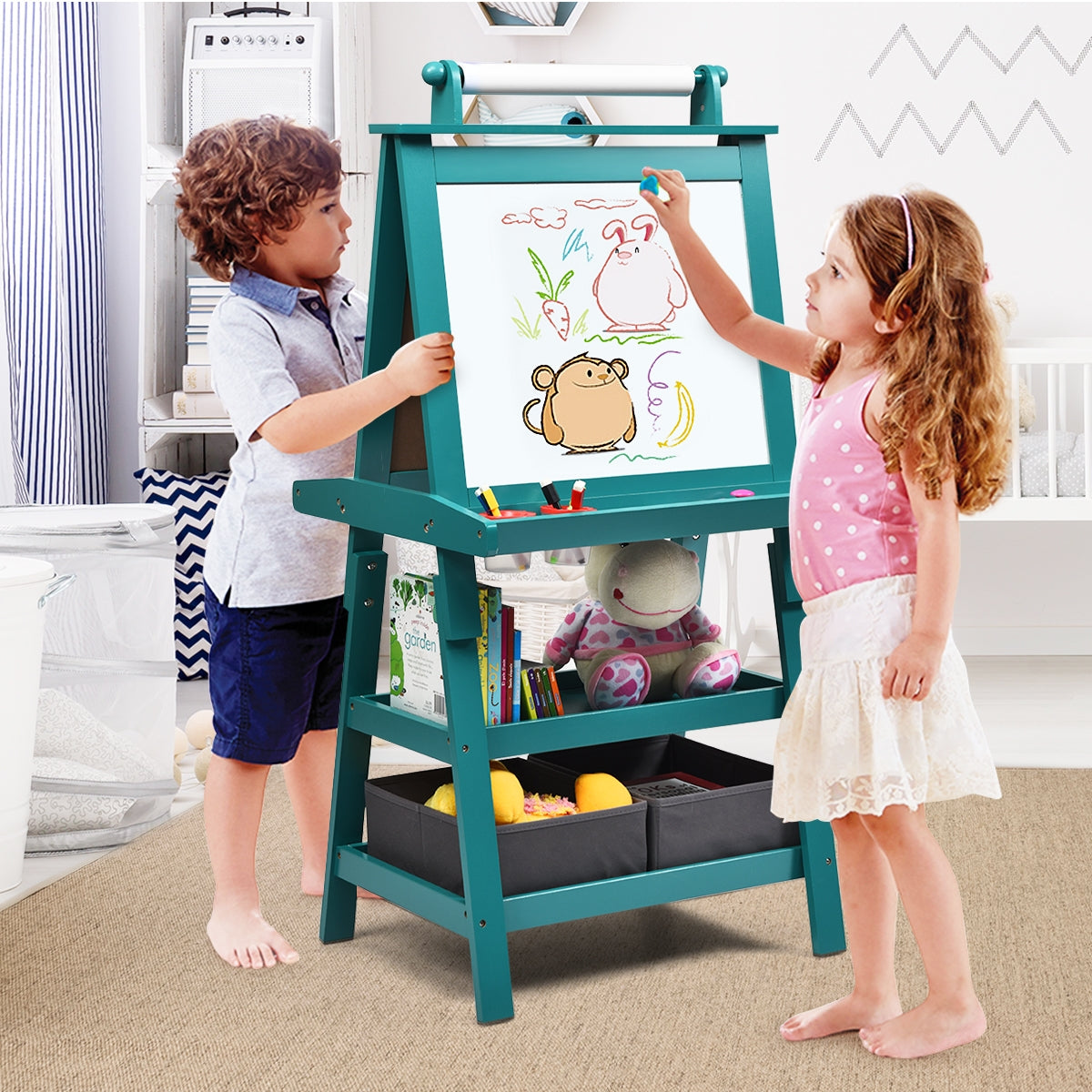 Caballete para Crianças de Dupla Face 3 em 1 com 2 Prateleiras, 2 Caixas e Tabuleiro Amplo Azul 59 x 50 x 117 cm