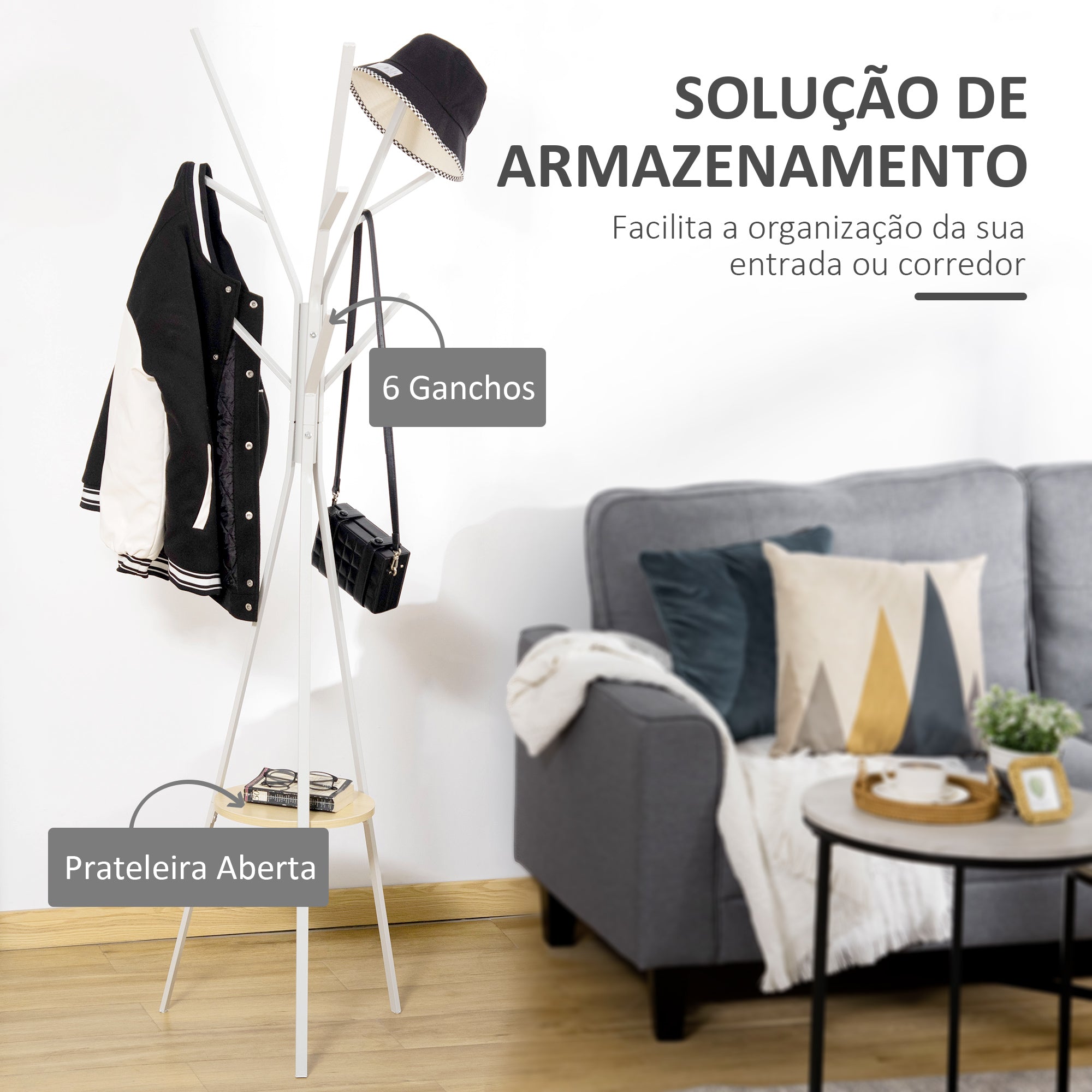 Cabide de Pé Moderno Branco 45x45x180 cm com 9 Ganchos e Prateleira