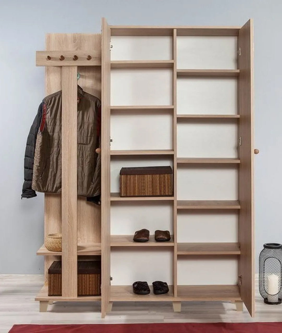 Medindo 135 cm de largura, 192 cm de altura e 36 cm de profundidade, este Cabideiro oferece amplo espaço de armazenamento para todos os seus itens essenciais. As numerosas prateleiras e o cabideiro multifuncional permitem que você mantenha seus casacos, sapatos, bolsas e muito mais organizados e de fácil acesso. A largura da prateleira de 45 cm e a altura da prateleira de 29 cm oferecem bastante espaço para seus pertences, enquanto a altura das pernas de 10 cm adiciona um toque de elegância ao design.