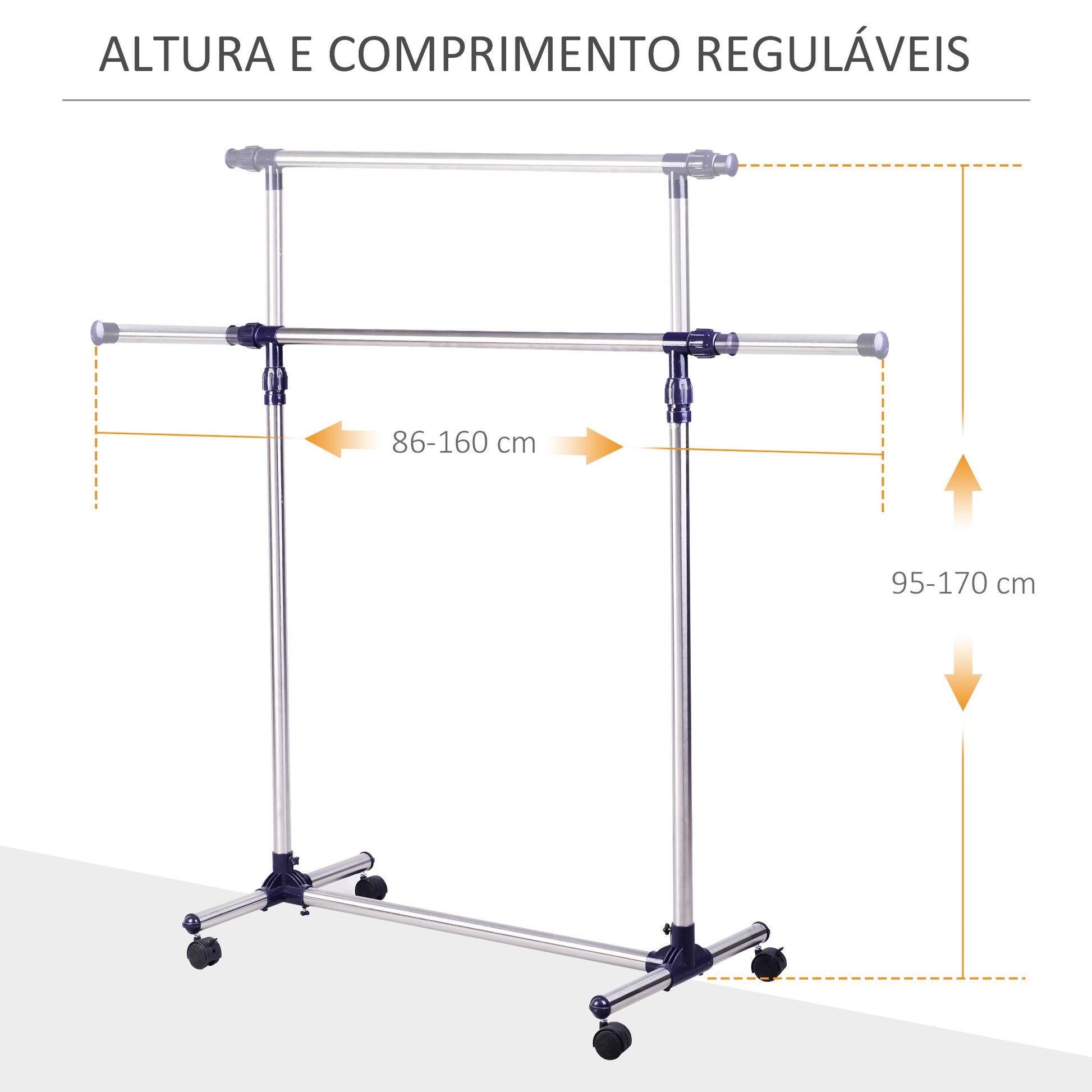 Cabideiro Ajustável em Aço Inoxidável 86-160x45x95-170cm - Prata