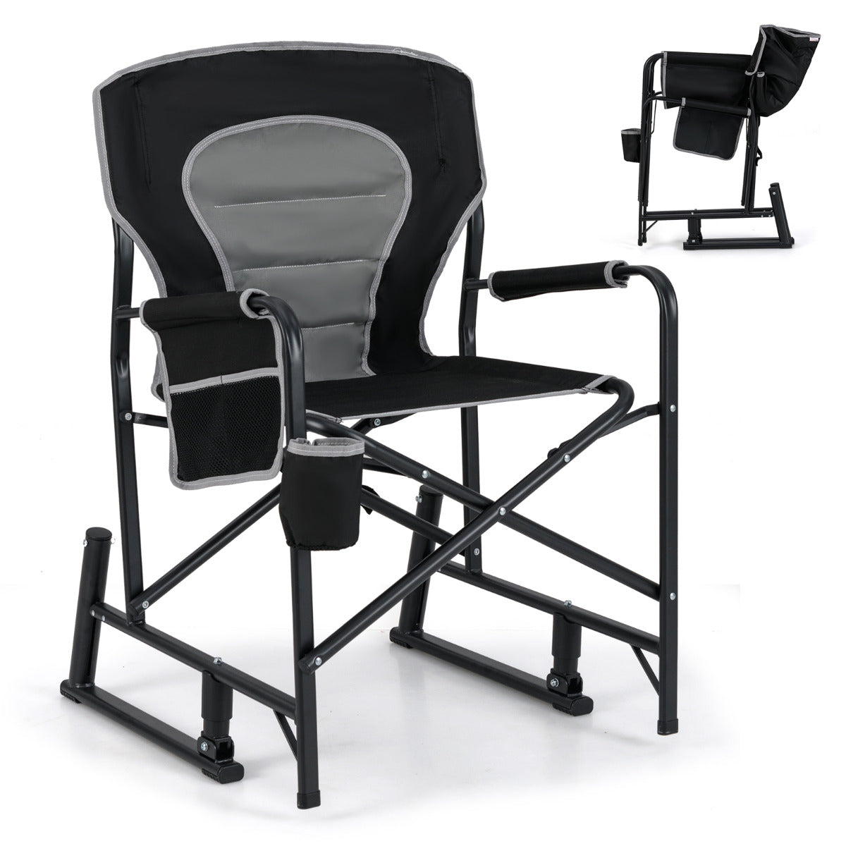 - Movimento de Balanço para Maior Conforto: Esta cadeira de campismo exterior vem com um inovador mecanismo de balanço de molas duplas. O mola da frente melhora o conforto ao amortecer o movimento para a frente, e a mola de trás facilita um movimento suave de balanço para cima e para baixo.