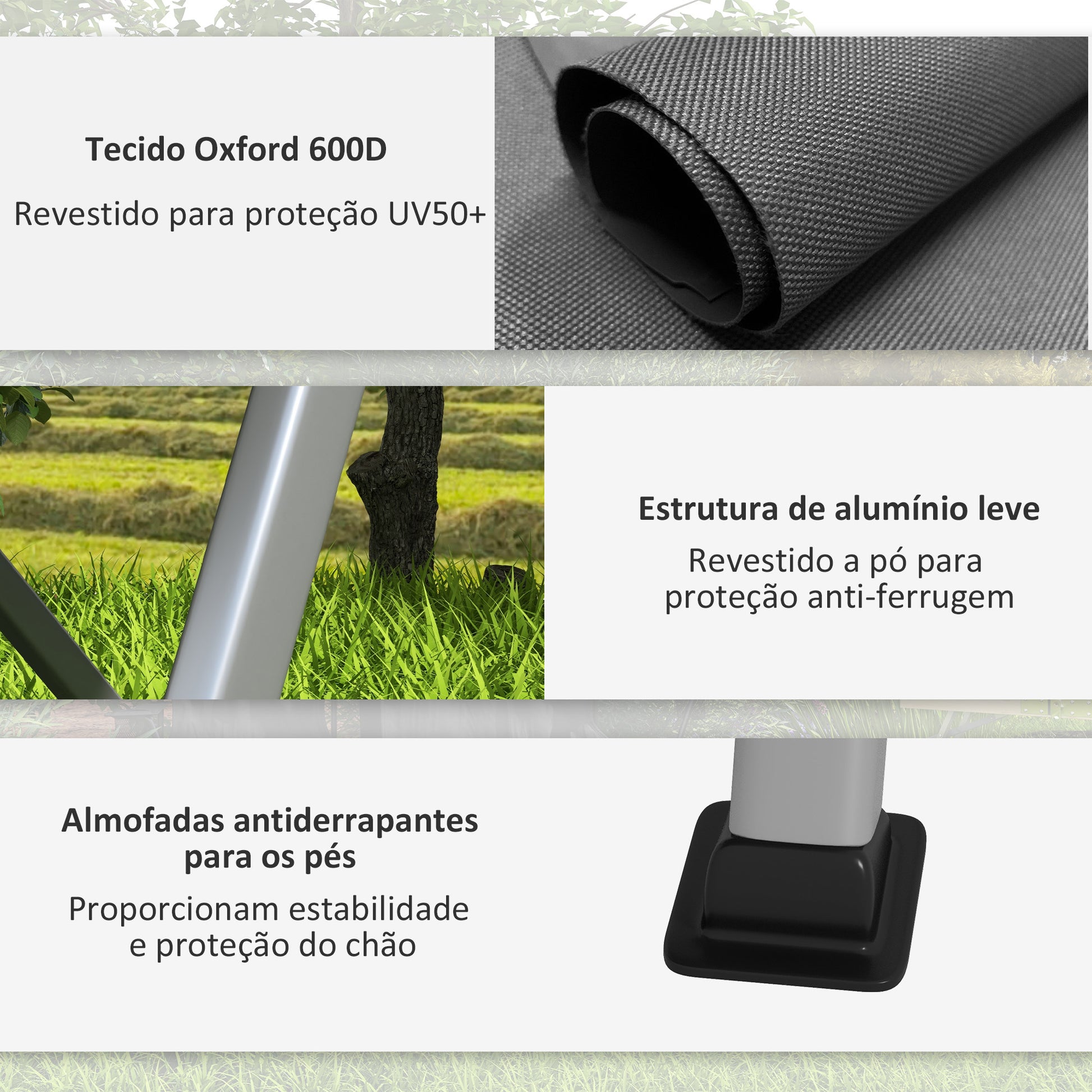 - Materiais: Estrutura de alumínio com revestimento em pó e tecido Oxford 600D com proteção UV50+