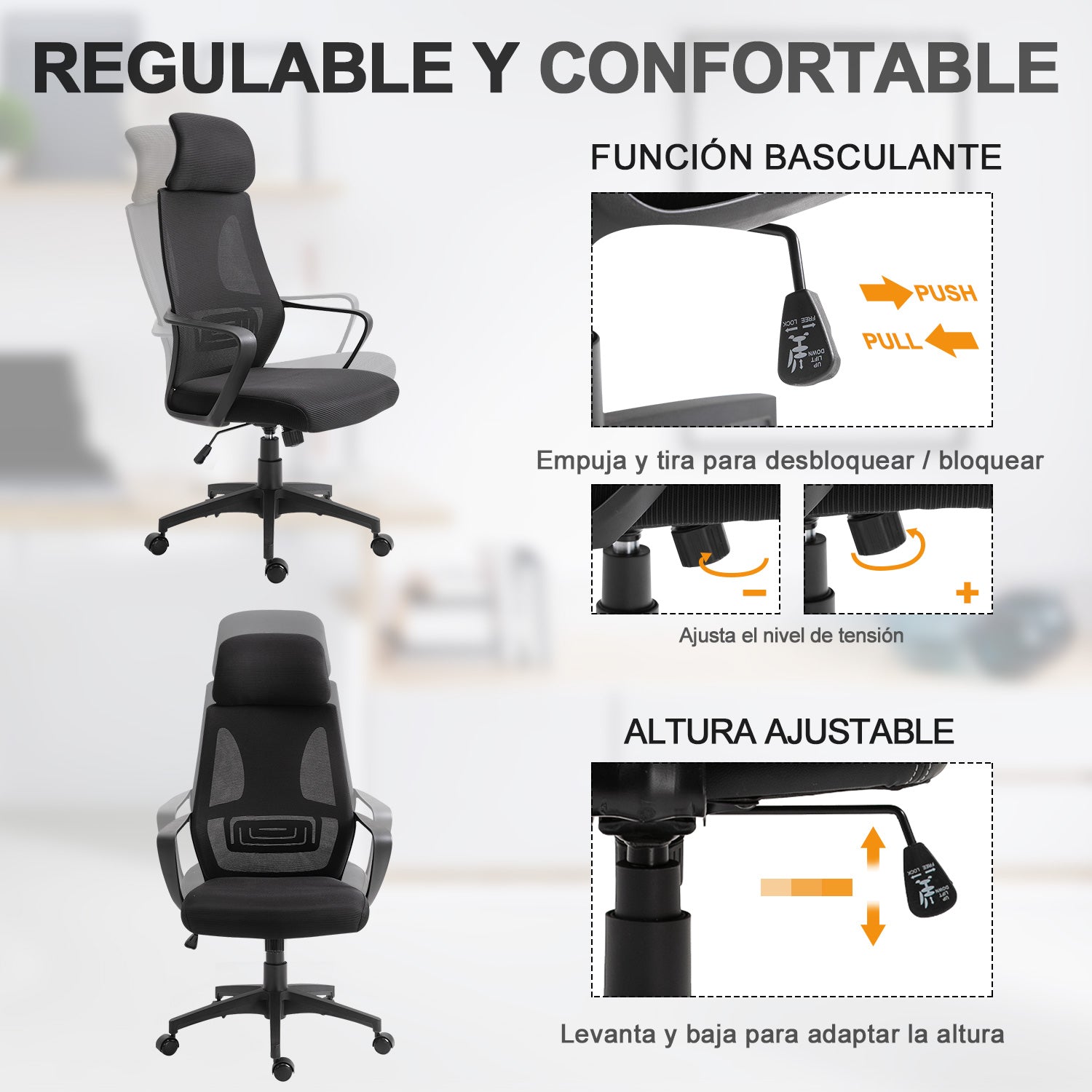 Esta cadeira de escritório destaca-se pelo desenho que se adapta a cada corpo, o assento acolchoado grosso e o encosto de malha respirável, proporcionando grande conforto durante as horas de estudo ou trabalho.