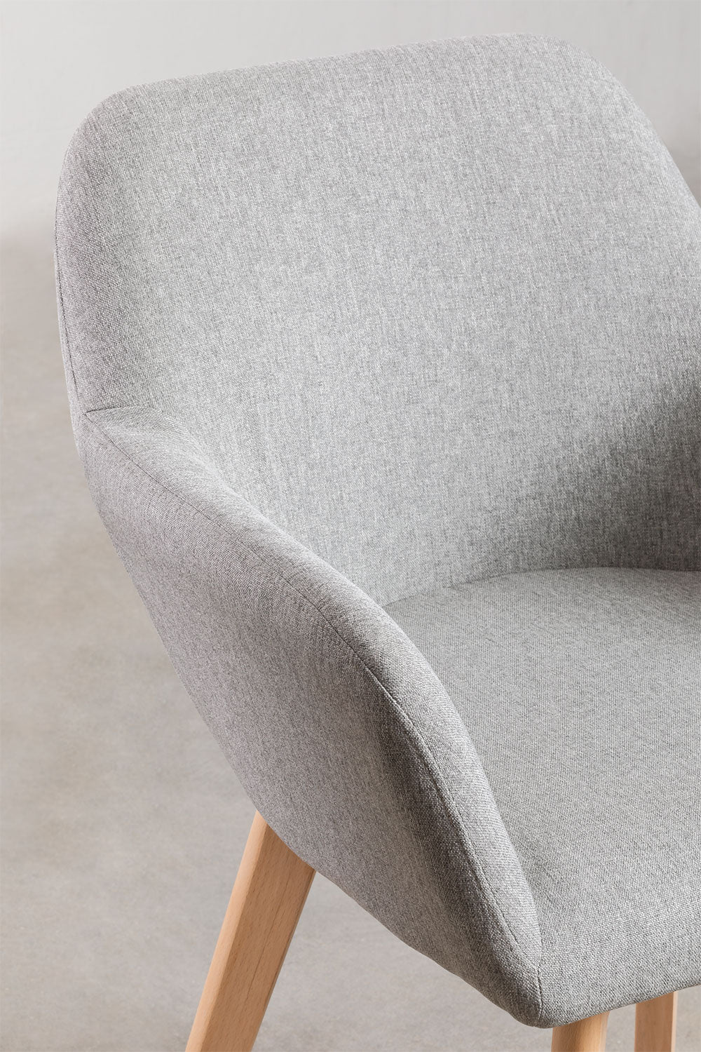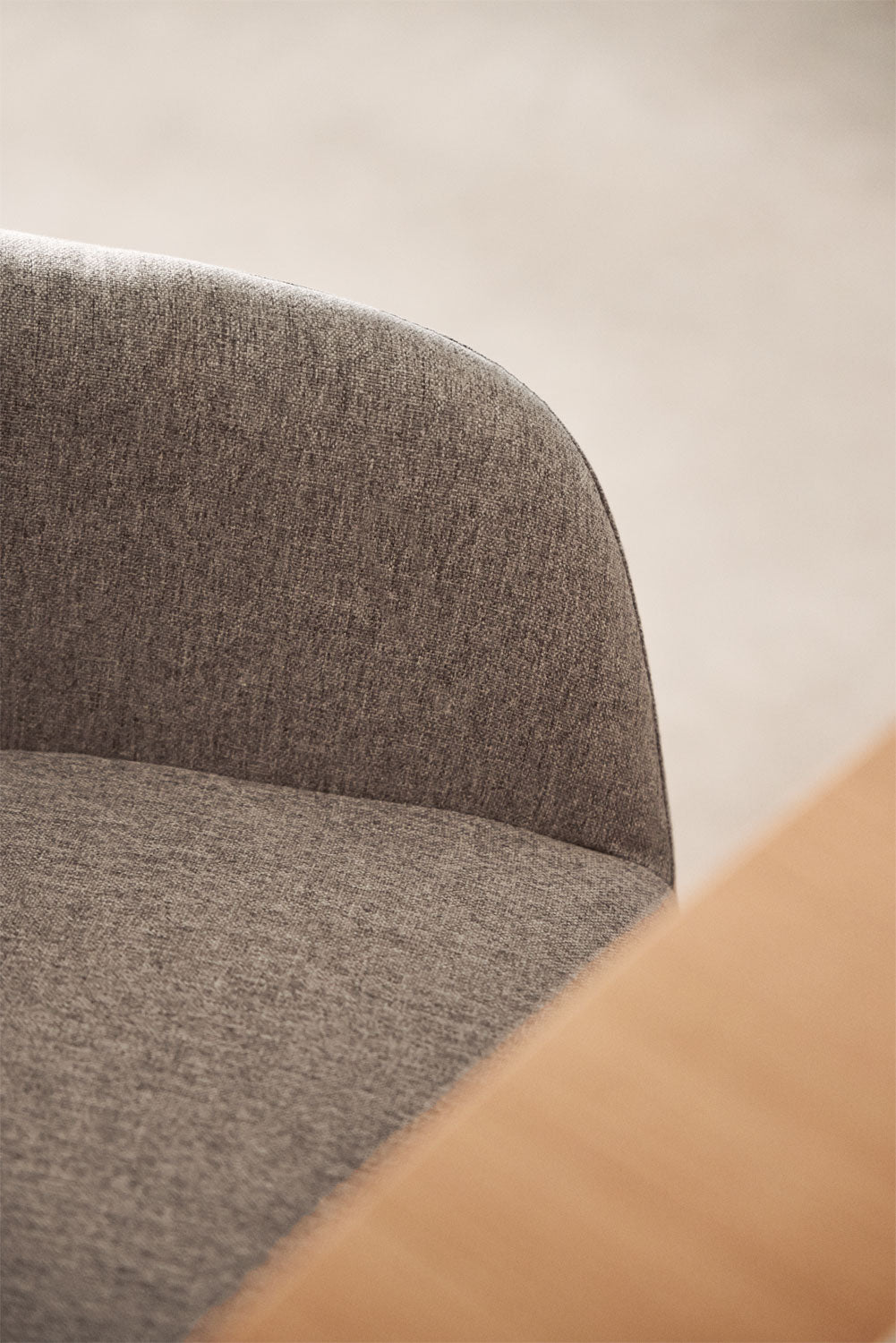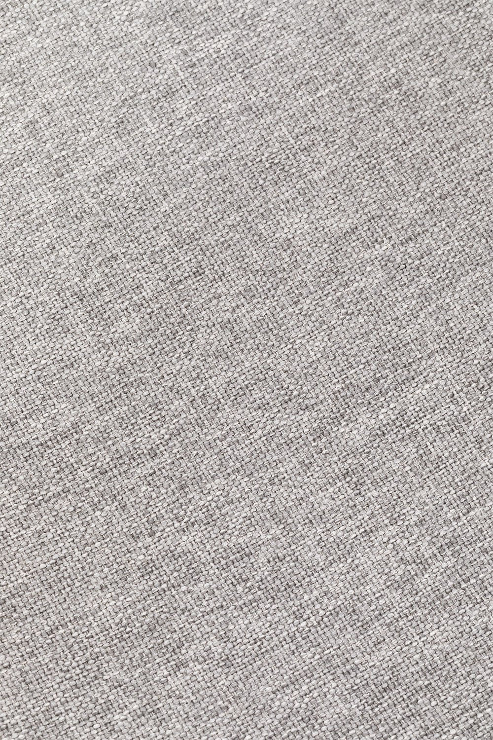 O assento, o encosto e os apoios de braços são totalmente estofados em tecido de poliéster cinza claro, proporcionando suavidade ao toque e bem-estar no dia a dia. As pernas em madeira de faia natural conferem robustez, durabilidade e um contraste elegante com o estofamento. O detalhe do zíper decorativo no encosto acrescenta personalidade e um toque sofisticado ao design.