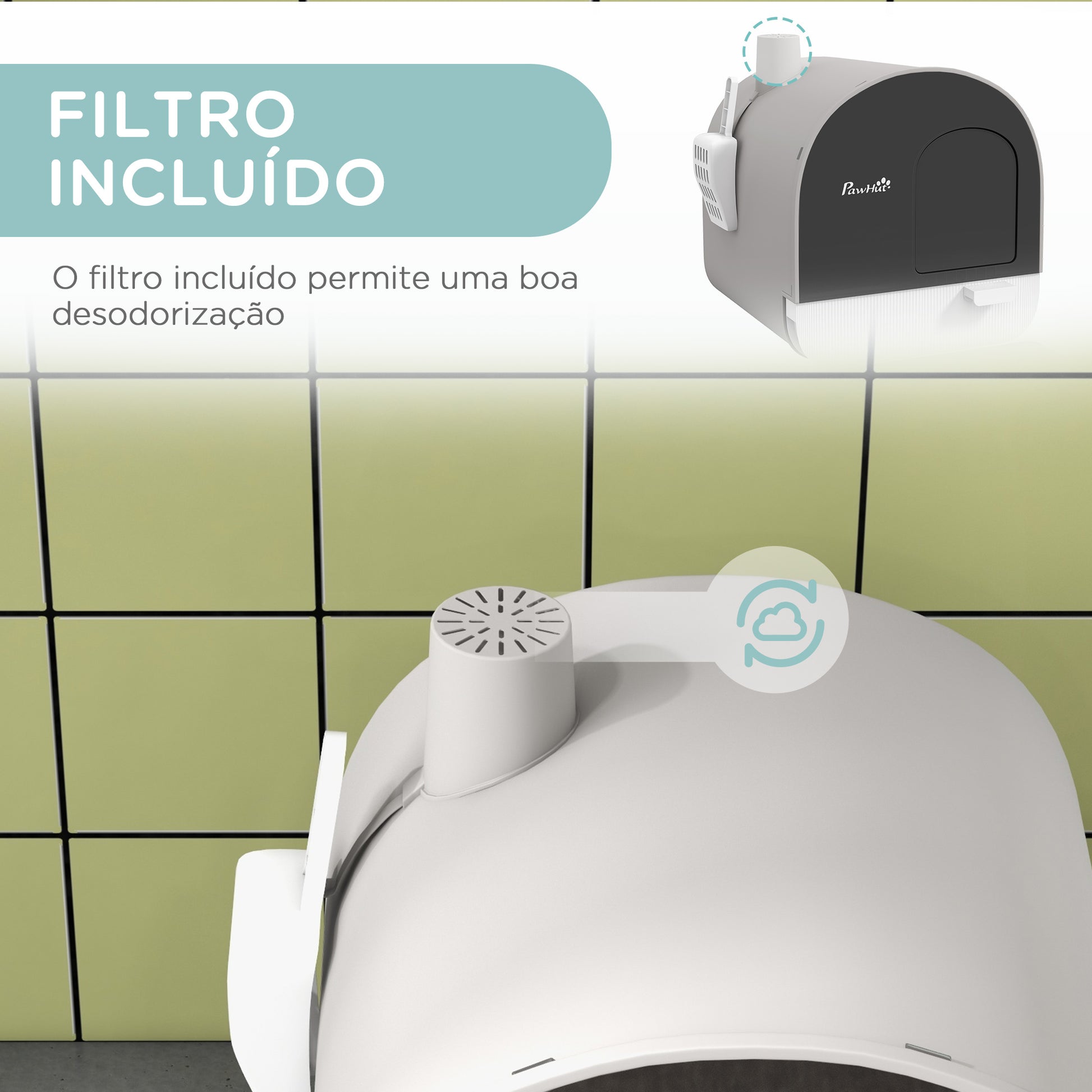 - Benefícios: Desenho fechado para privacidade, bandeja deslizante para limpeza fácil, filtro desodorizante incluído.
