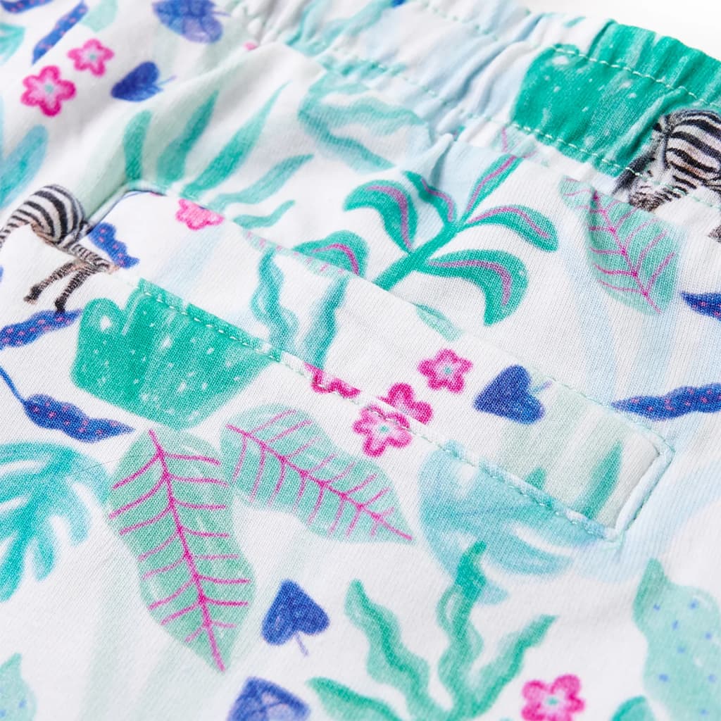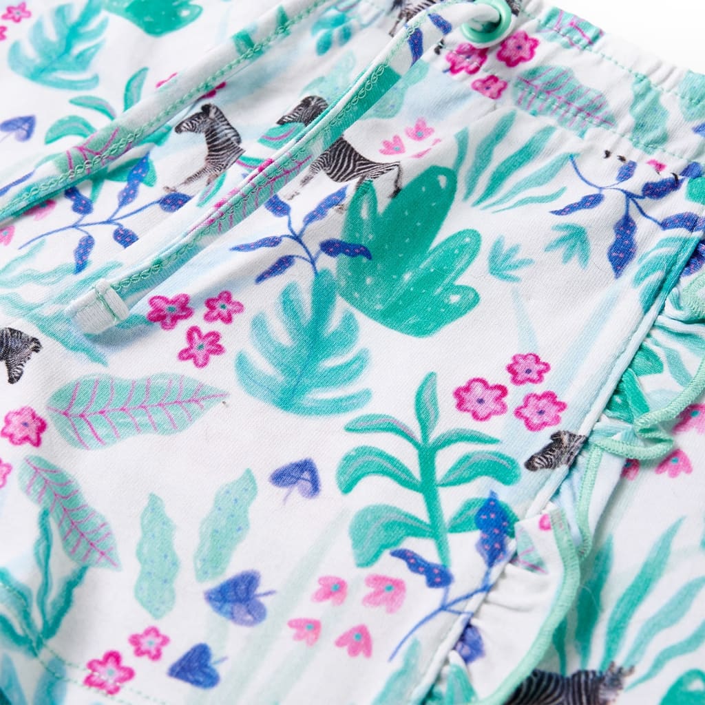 Este calção para criança possui um cós elástico com cordão, um bolso traseiro debruado e adoráveis folhos. Os calções para criança apresentam uma estampa de zebras e plantas por toda a parte e são feitos de um material macio que inclui 94% algodão e 6% elastano, proporcionando conforto e respirabilidade.