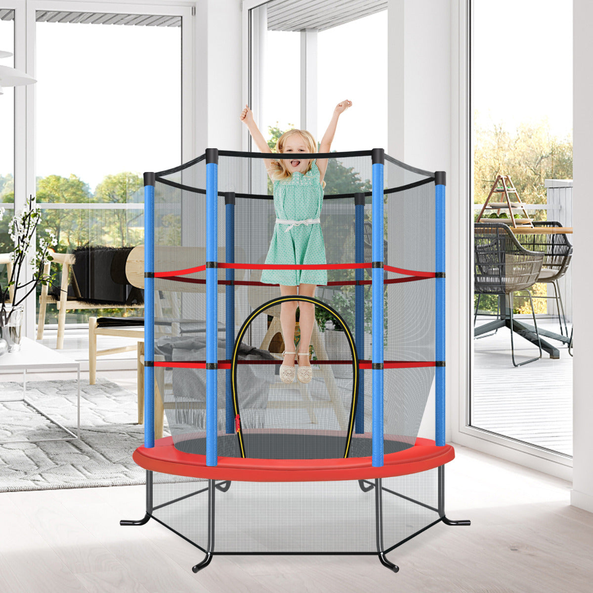 - Rede de segurança para proteção completa: a rede a 360° protege contra quedas, enquanto a rede inferior evita que as crianças fiquem presas por baixo do trampolim, assegurando a estabilidade.