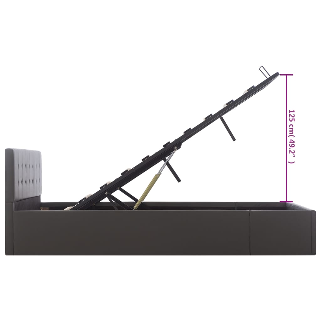 Esta estrutura de cama estofada transforma o espaço não utilizado debaixo do colchão numa área de arrumação, com amplo espaço para guardar roupas, lençóis, cobertores etc. O mecanismo hidráulico de elevação a gás facilita a elevação do colchão. A base de ripas permanecerá em cima, quando elevada, para que consiga ter ambas as mãos livres ao retirar ou guardar artigos por baixo.