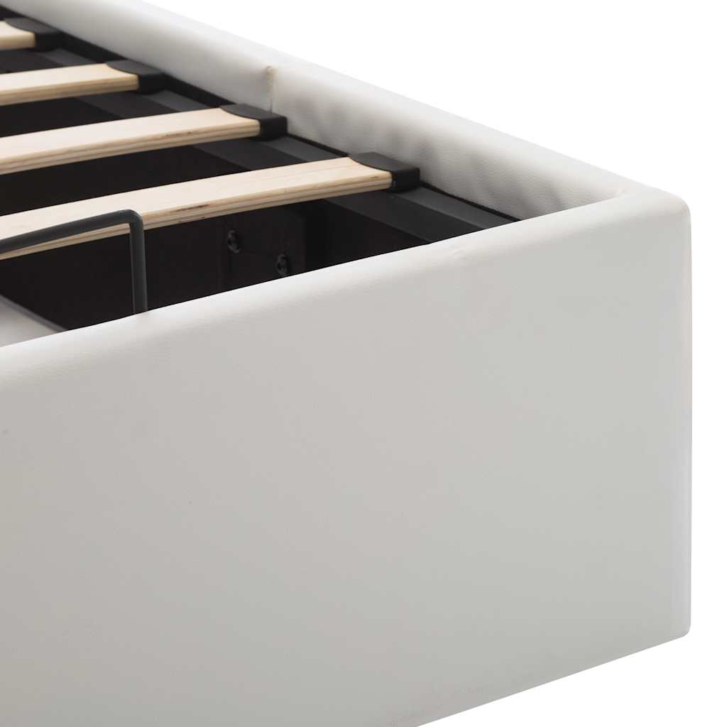 A estrutura de aço revestido a pó e as ripas de madeira compensada aumentam a robustez e a durabilidade da cama. Estofada com couro artificial brilhante, esta cama com arrumação é convidativa e fácil de cuidar. Este produto é fácil de montar. A mobília de quarto é adequada para um colchão de 180 x 200 cm.