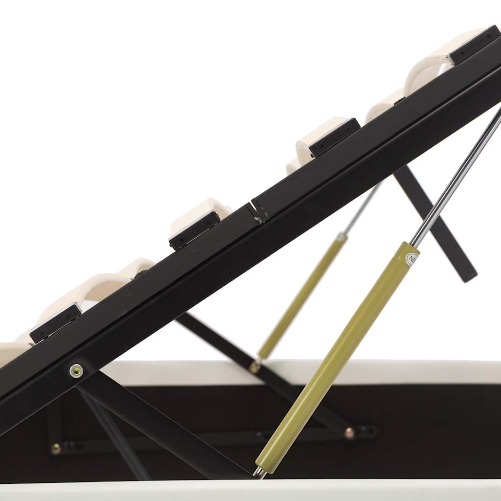 Esta estrutura de cama estofada transforma o espaço não utilizado debaixo do colchão numa área de arrumação, com amplo espaço para guardar roupas, lençóis, cobertores etc. O mecanismo hidráulico de elevação a gás facilita a elevação do colchão. A base de ripas permanecerá em cima, quando elevada, para que consiga ter ambas as mãos livres ao retirar ou guardar artigos por baixo.