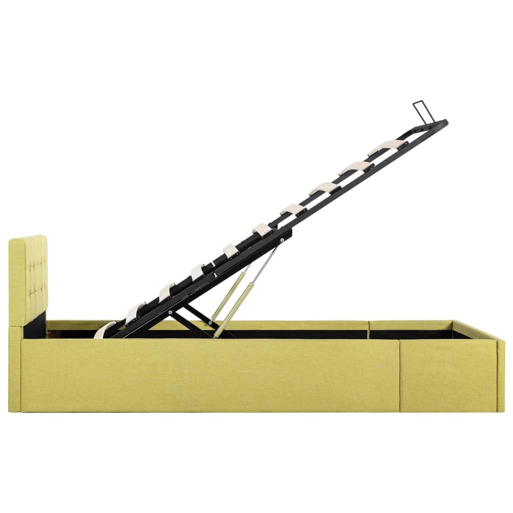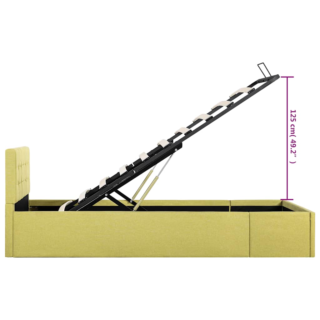 Esta estrutura de cama estofada transforma o espaço não utilizado debaixo do colchão numa área de arrumação, com amplo espaço para guardar roupas, lençóis, cobertores etc. O mecanismo hidráulico de elevação a gás facilita a elevação do colchão. A base de ripas permanecerá em cima, quando elevada, para que consiga ter ambas as mãos livres ao retirar ou guardar artigos por baixo.