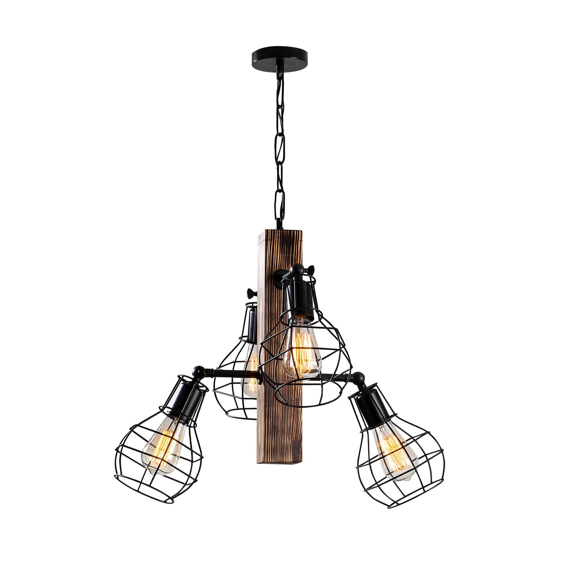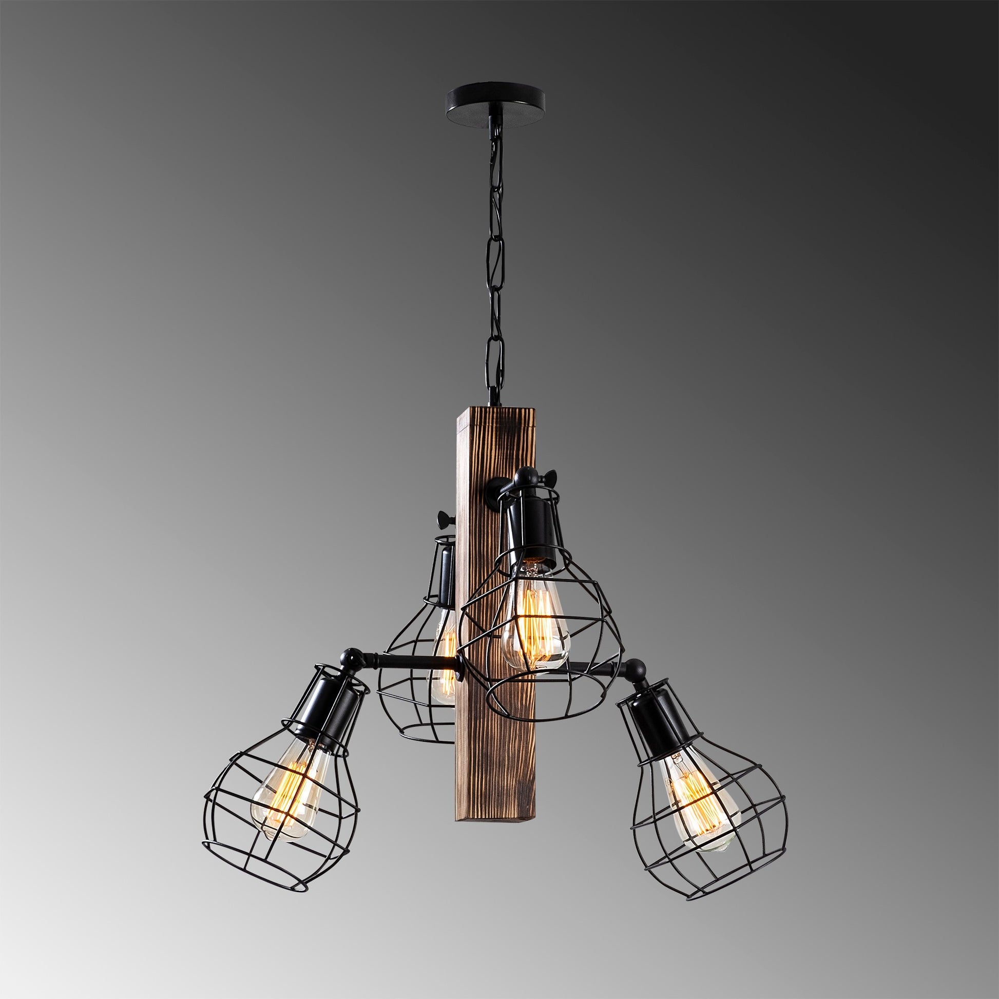 Candeeiro de Teto moderno com corpo em madeira de carpa e tampa de ferro, 42 x 42 cm, altura: 79 cm | 4 x E27 máx. 40 W | Acabamento em preto e madeira, perfeito para decoração industrial e rústica