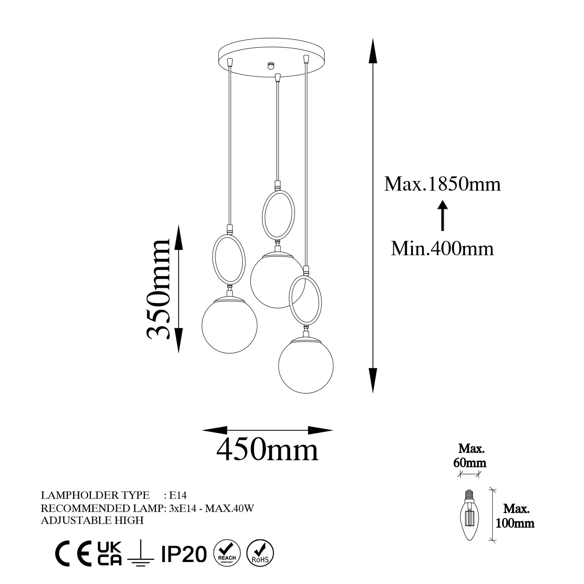 Com a sua classificação ip 20, este candeeiro é perfeito para utilização no interior, permitindo-lhe criar uma atmosfera acolhedora e convidativa na sua sala de estar, sala de jantar ou quarto. O comprimento do cabo de 120 cm proporciona flexibilidade na instalação, garantindo que pode posicioná-lo exatamente onde desejar. Os três casquilhos e14 permitem a utilização de um máximo de lâmpadas de 40 w, proporcionando uma iluminação ampla para iluminar o seu espaço.