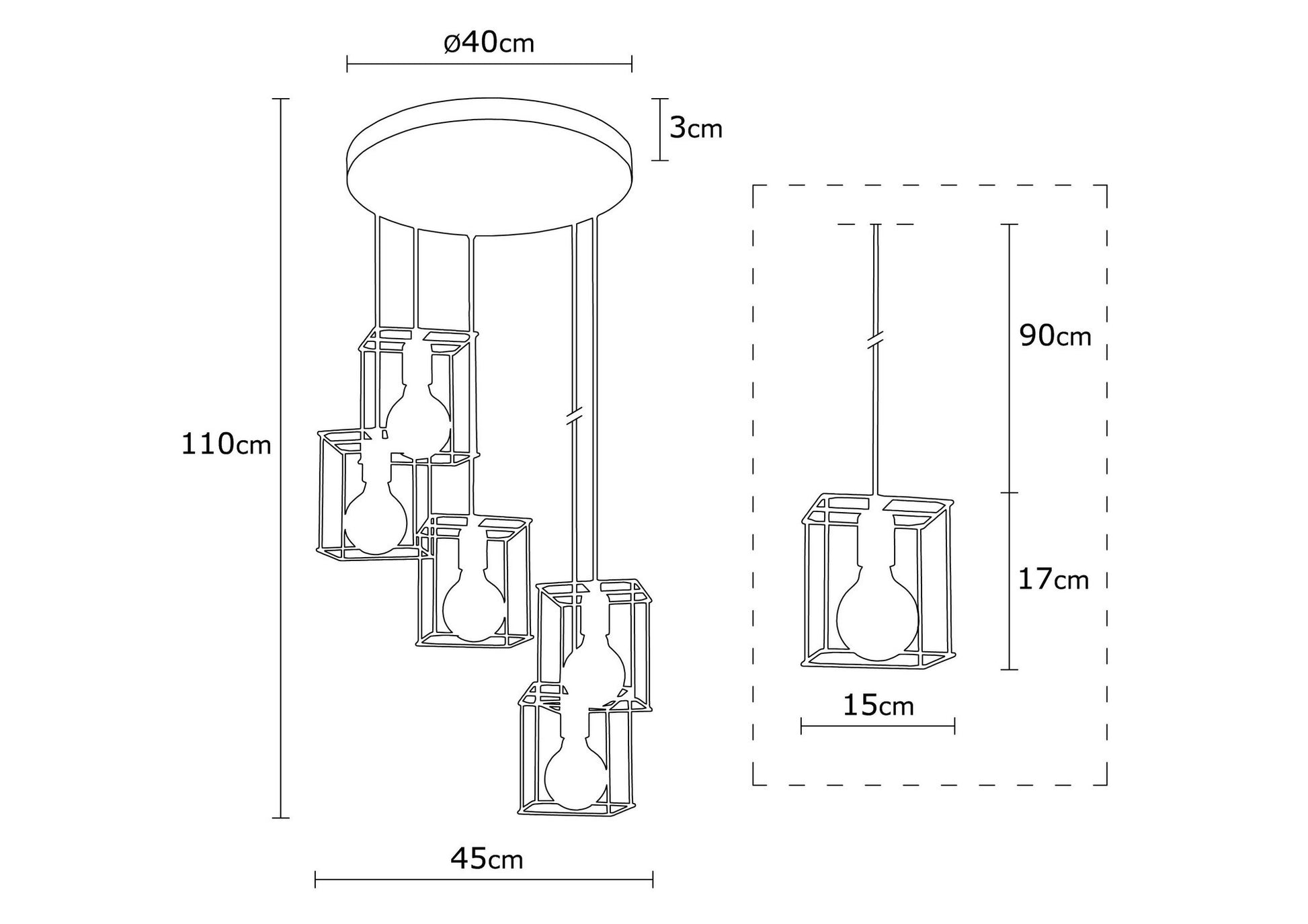Com um diâmetro de 45 cm e uma altura de 110 cm, este lustre é o tamanho ideal para pendurar sobre uma mesa de jantar ou em um hall de entrada. O brilho suave e quente das cinco lâmpadas E27 (máx. 40W) criará uma atmosfera acolhedora e convidativa para você e seus convidados desfrutarem.