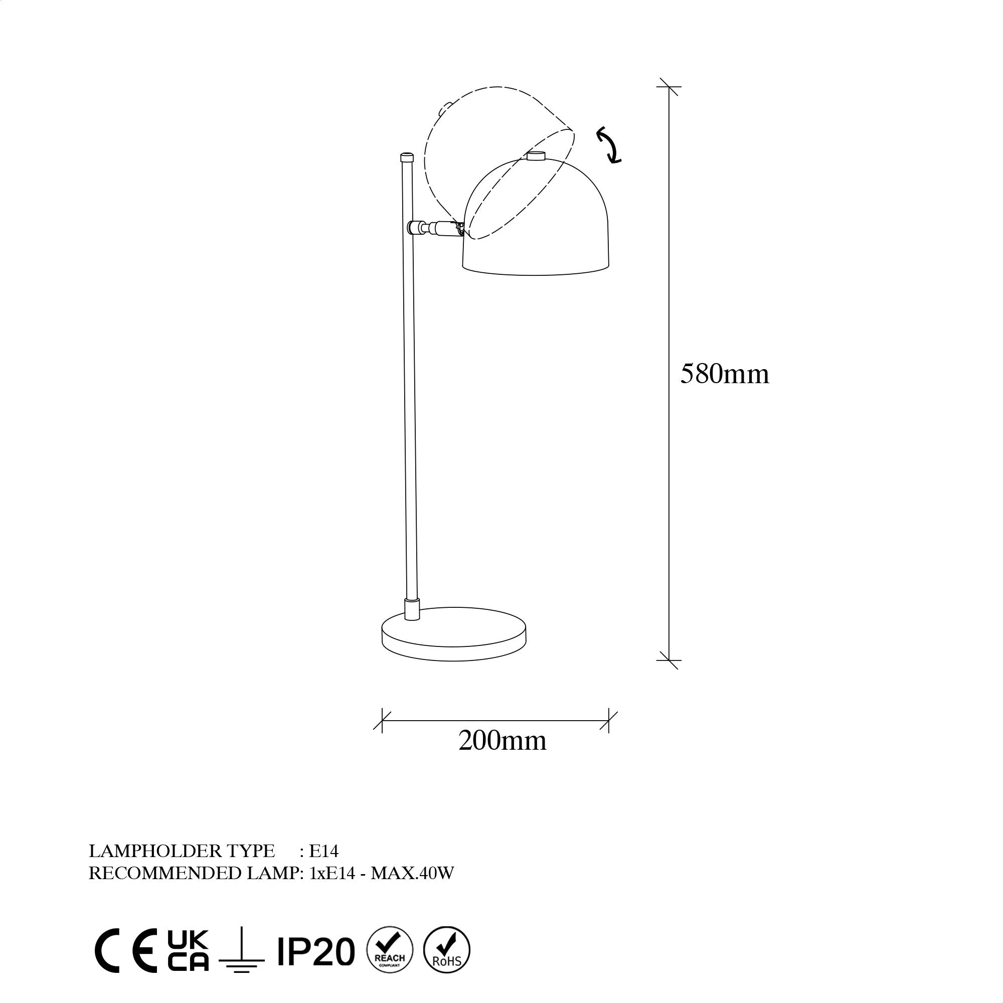 Com 18 x 20 x 58 cm, este candeeiro de mesa tem o tamanho ideal para se adaptar perfeitamente a qualquer espaço. A sua placa de base, com um diâmetro de 18 cm e uma altura de 2 cm, proporciona estabilidade e garante que o candeeiro se mantém firmemente no lugar. O comprimento do cabo de 200 cm oferece flexibilidade na colocação do candeeiro onde desejar.